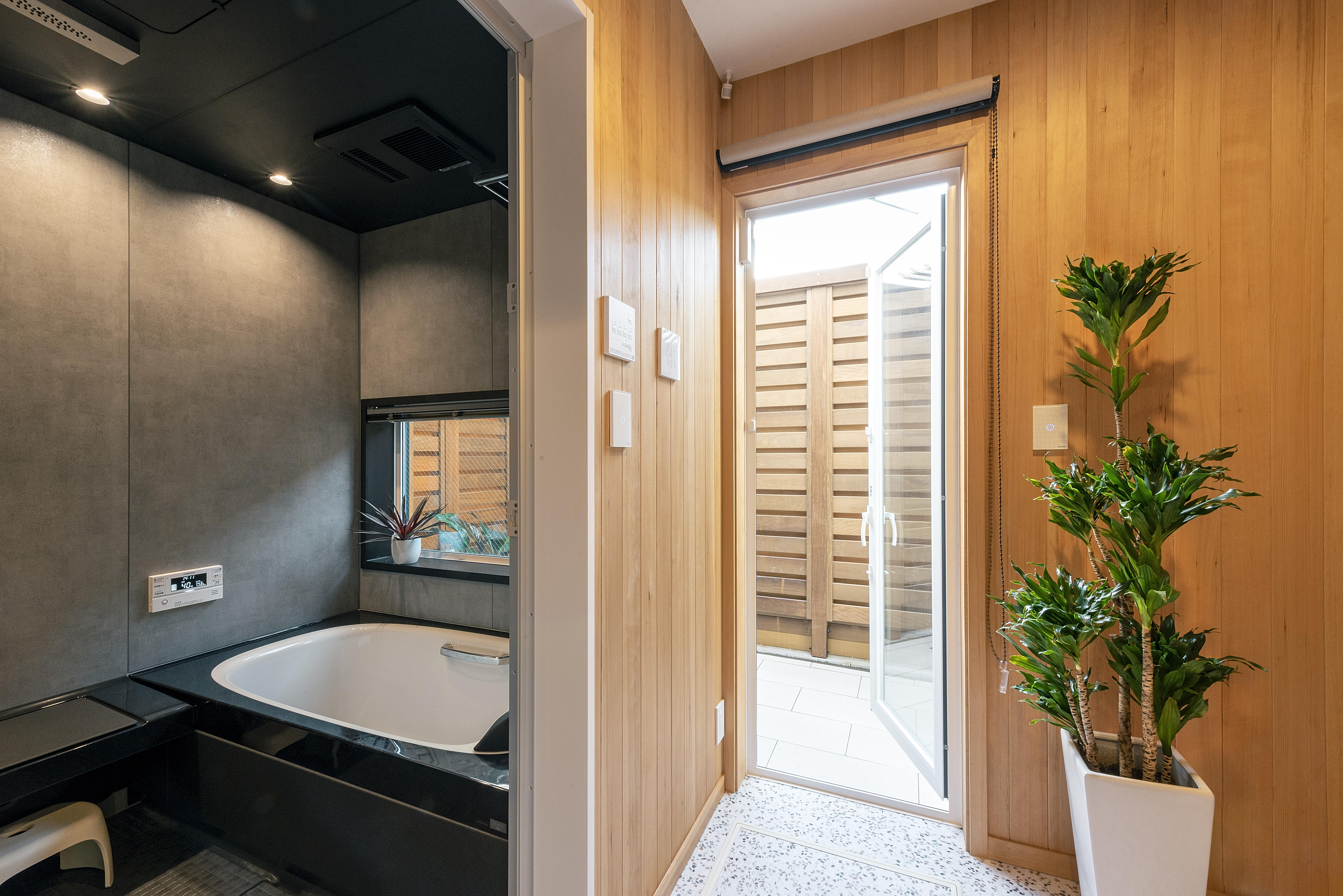浴室からは脱衣所、洗濯室、物干し室、パントリー、そしてキッチンへと繋がっています。