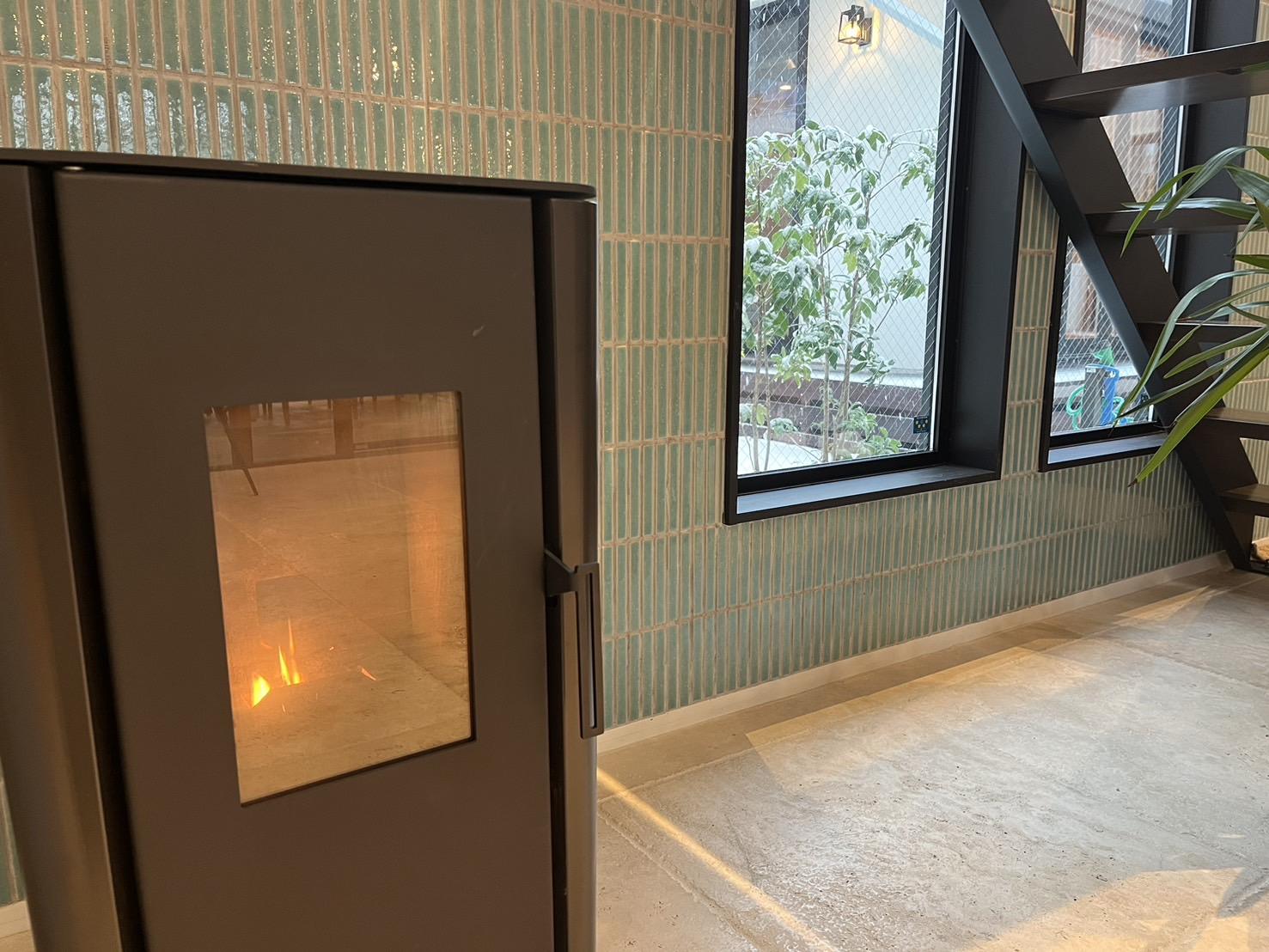 事務所内はペレットストーブでぽかぽかです^^
