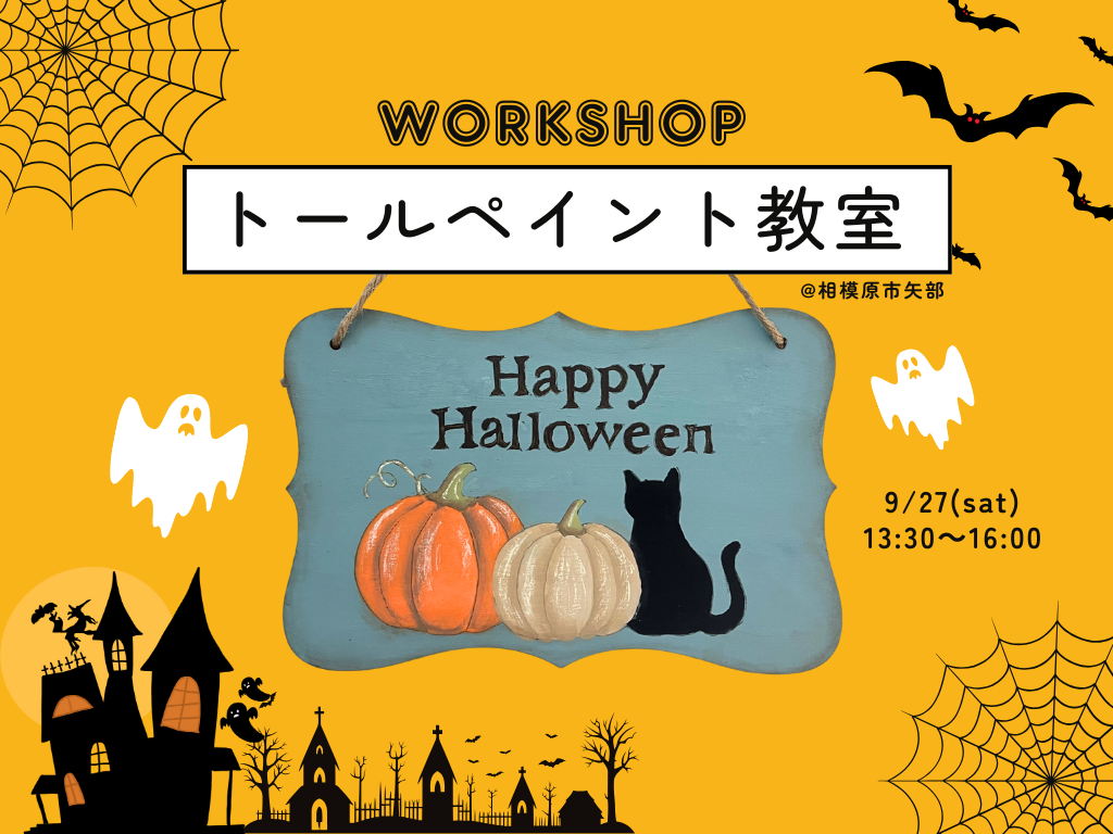 木のプレートにアクリル絵の具でハロウィンモチーフを描く、季節限定のトールペイント体験。初心者の方にも楽しんでいただけるよう丁寧にサポートします。完成した作品はお部屋や玄関の飾りにぴったりです。