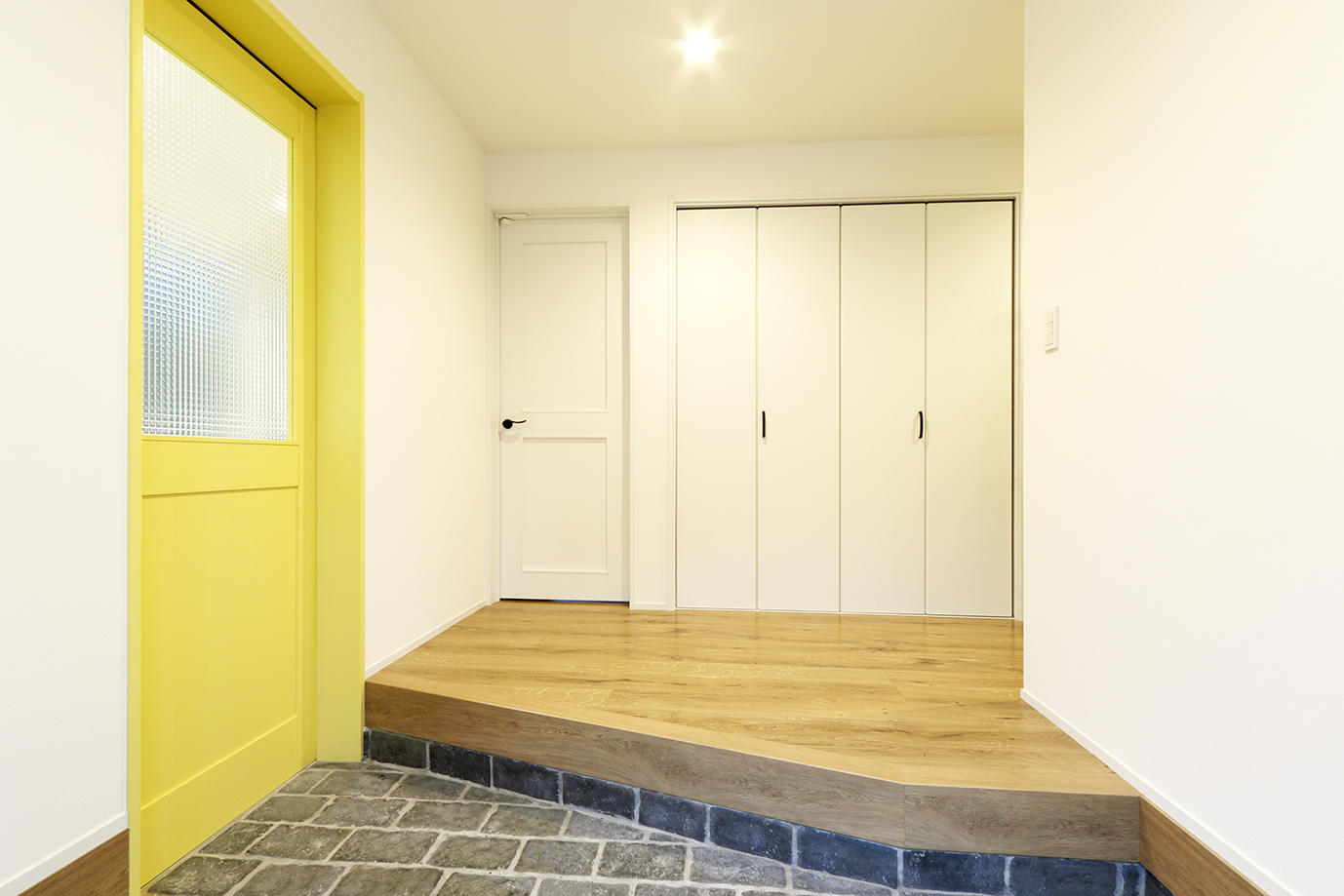 光が差し込まない閉鎖的な空間を茶系からホワイト系に変更。靴箱は全て撤去し、玄関横にあった水廻りスペースを移設し、玄関から直接出入り出来るシューズクロークにしました。扉は上部がチェッカーガラス入りの優しく明るいイエローに塗装。広くなった床には、ヨーロッパの古い街道の石畳のような重厚さとカジュアルな雰囲気を作り出す明るいグレー色の舗装材を取り入れました。