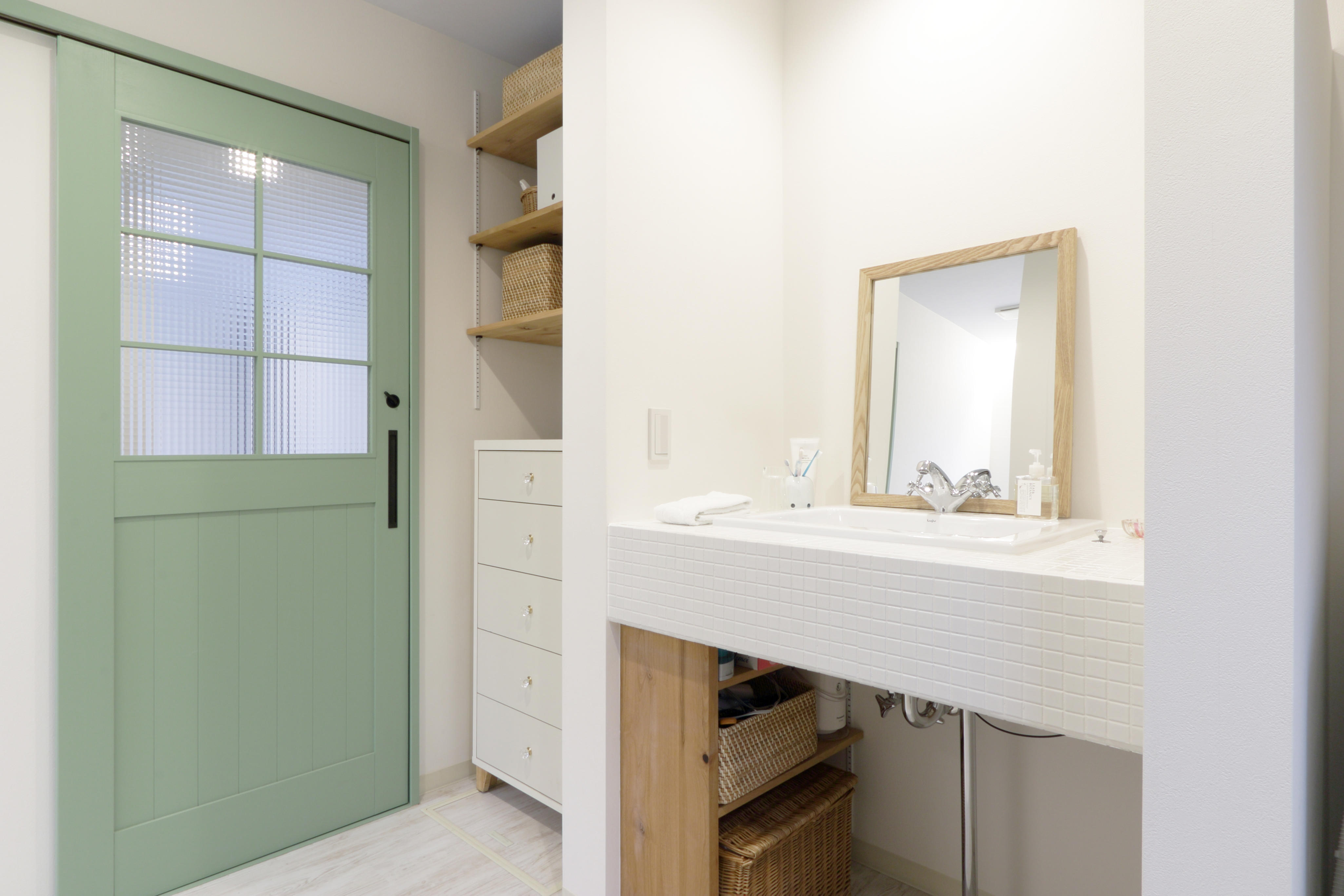 来客時や2階からの動線を考え、階段横の6帖洋室だった空間に洗面とトイレを移設。洗面台は、長身の旦那さまでも使いやすい様に高めにし、上にはニッチ、下には見えない様に可動収納スペースを設けました。また、窓のない廊下を明るくする為、土間スペースの扉同様ガラス入りにし爽やかなペパーグリーンに塗装。腰壁で覆ったエリアは洗濯機スペースにしました。