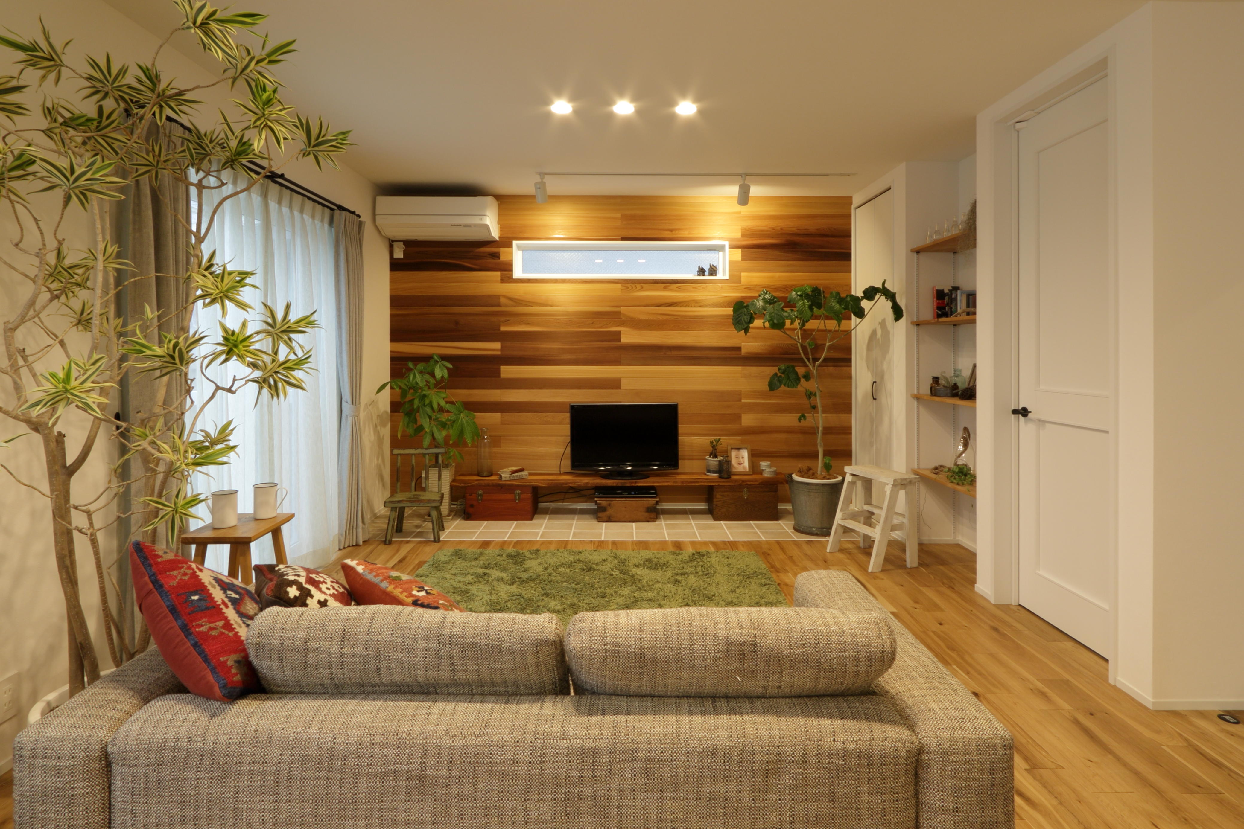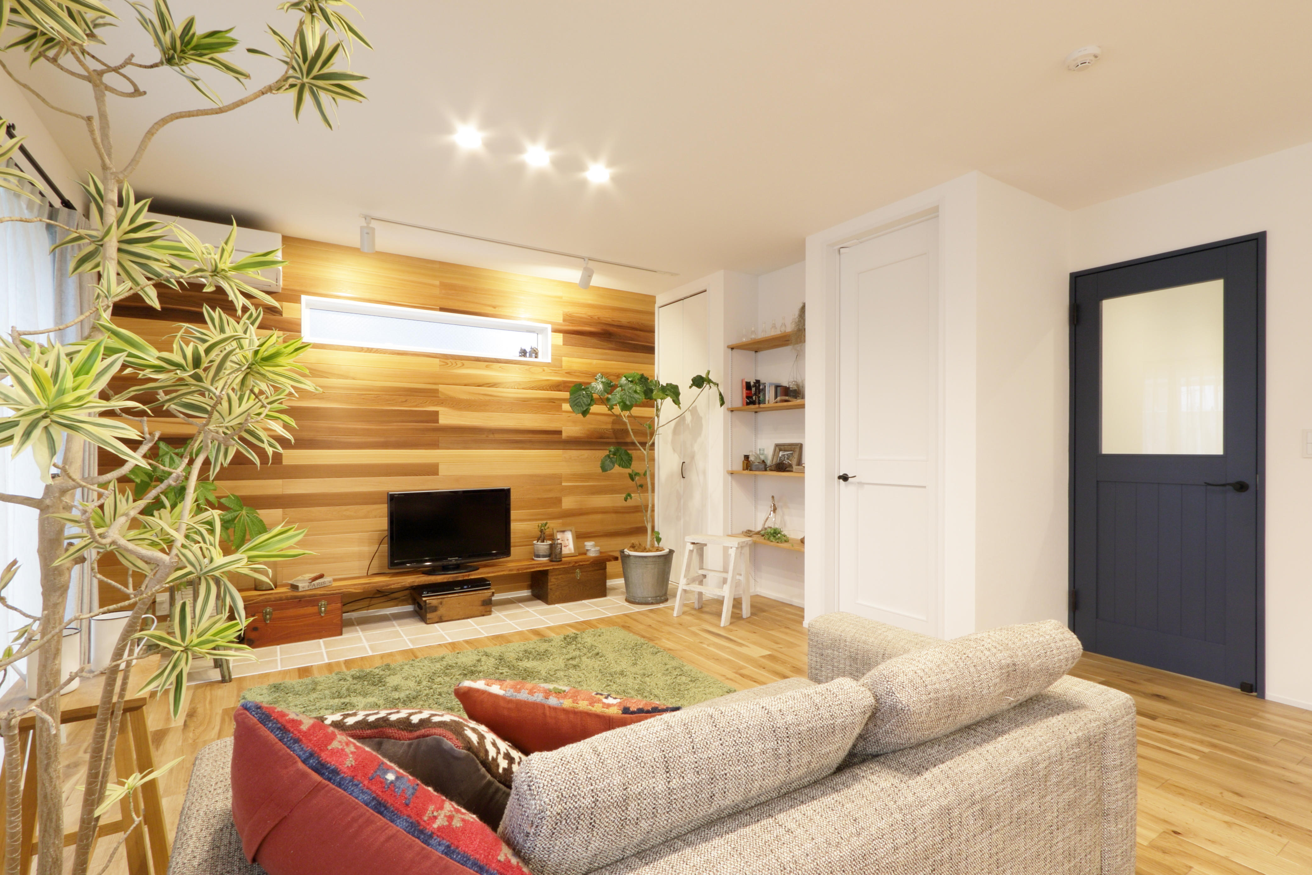 リビングとダイニングの仕切りをなくし、広々空間に。隣家マンション側にあった腰窓を天井近くの横長スリットFIX窓にする事で、外からの視線をカットし、壁面を確保できました。テレビを置くスペースとして、壁面には温もり感のある木材(レッドシダー)の羽目板、床の一部をタイル貼りにしました。床全体は無垢材を使用し、光と風が溢れる温もり空間となりました。また、「お子様が成長した時に部屋に閉じこもる事がないようにしたい」というご希望を受け、廊下側にあった出入り口をリビング側に変更。リビングを必ず通る動線にしました。(白い扉が子供部屋ドア)