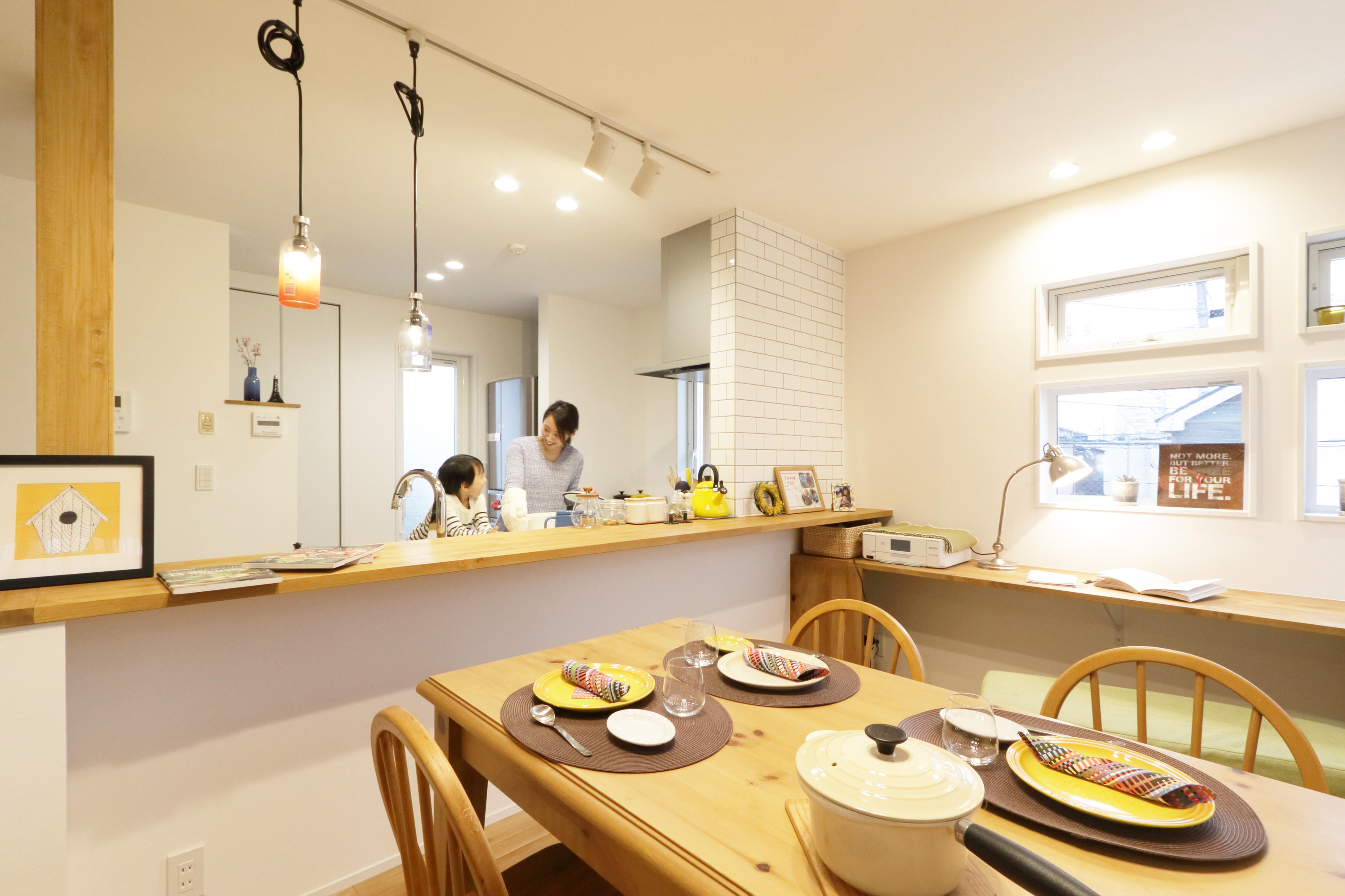 ダイニングは、”ママの居るキッチンにいつも家族が集う空間”をコンセプトにプランニングしました。キッチン前には対面カウンター、窓辺にはデスクカウンターを設置。 また、ダイニングテーブルを置くスペースは、配置変更が可能な広さを確保しているので、大人数でのお食事にも対応可能です。当初ダイニングに小上がりをご希望されていましたが、打合せを重ねる中で将来不要となると思い、なくす事をご提案しました。結果ダイニングが広々とし、デスクスペースも出来、ご満足いただきました。