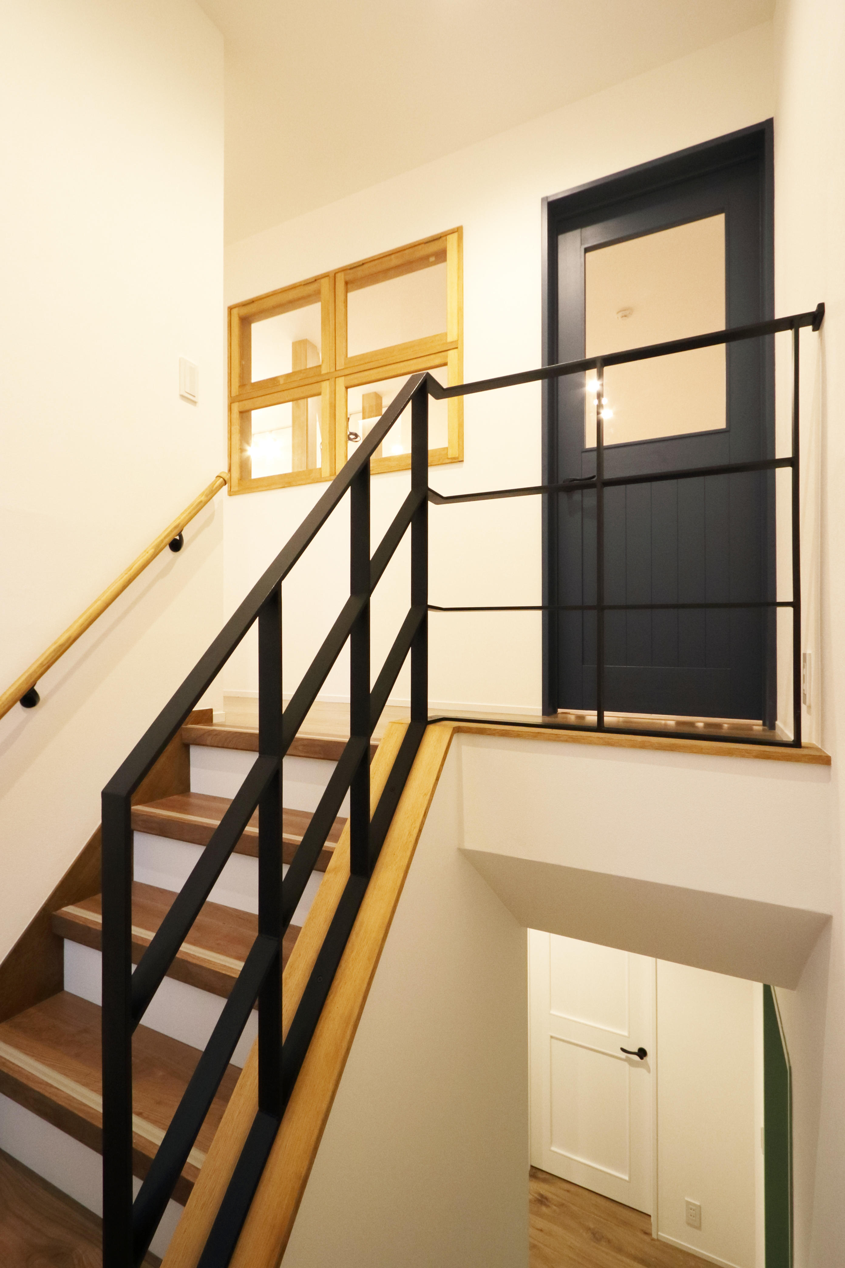 階段を上がって目の前に設置されていたクローゼットを撤去。大きい造作室内窓を設置することで、廊下にもリビングにも光と風が行きかうようになりました。リビングドア上部は光が通る透明ガラスを採用しました。階段は壁ではなく造作アイアンを設置することで開放感のあるスペースに。手すりは、手触りの良い無垢材を採用しました。