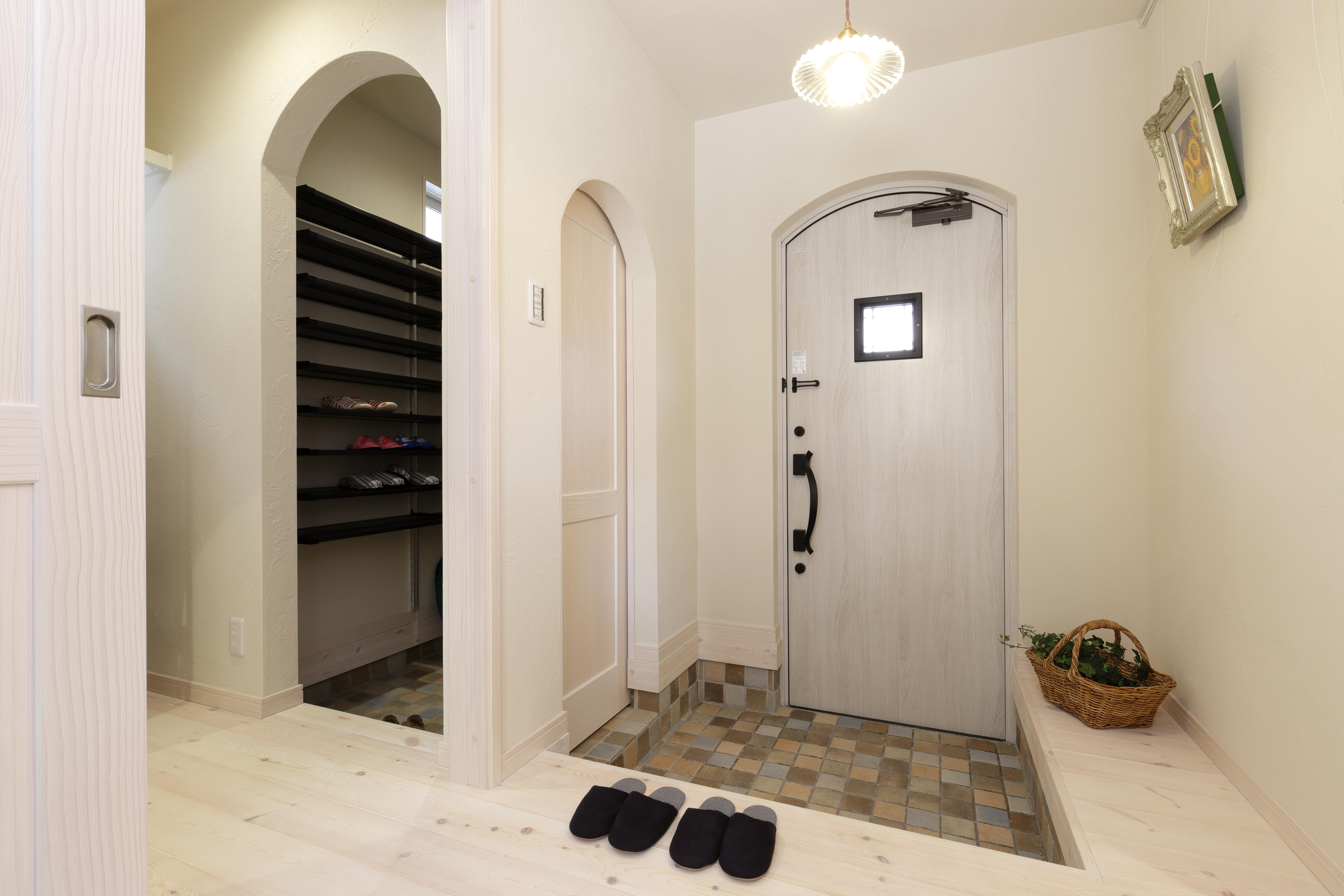 玄関ドアに合わせて、周囲の開口はアーチ型に。やわらかく、かわいらしい雰囲気の玄関に仕上がりました。