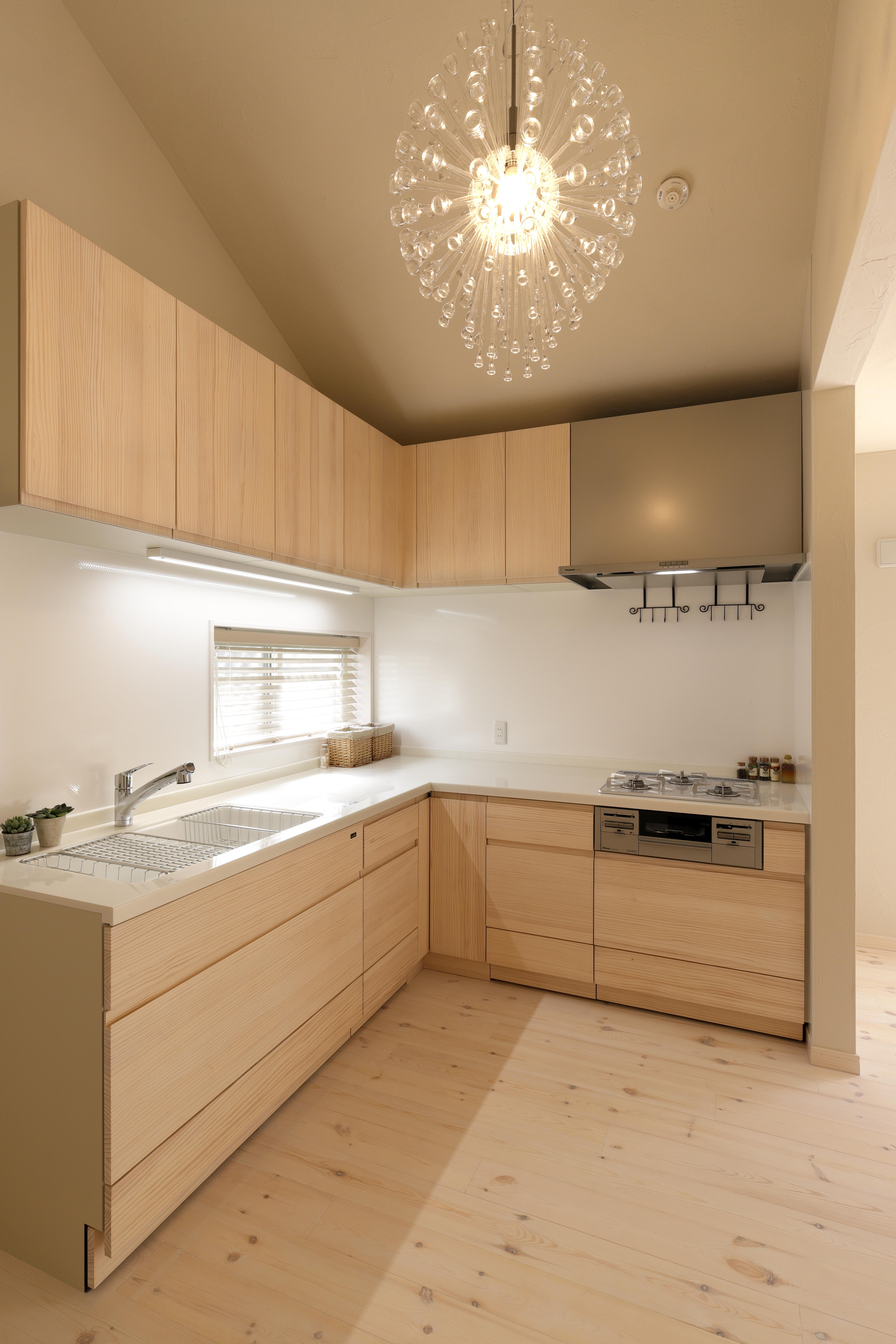 キッチンも部屋の雰囲気に合わせて無垢の扉キッチンを採用しました。