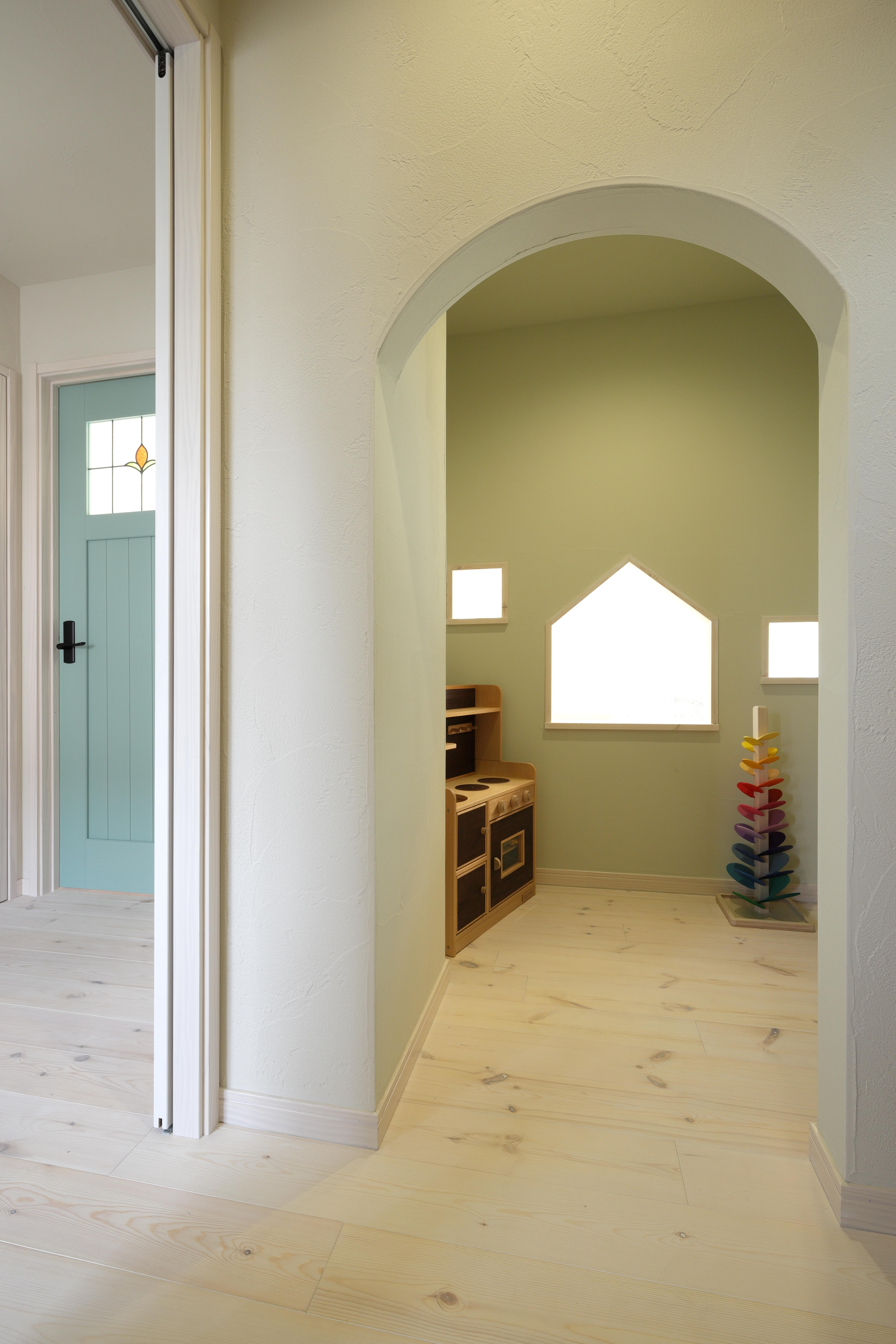 玄関横に秘密基地。おうち型窓からリビングに顔をのぞかせてお店屋さんごっこができたり、たまには飛び越えたり・・・。遊び方いろいろの秘密基地。