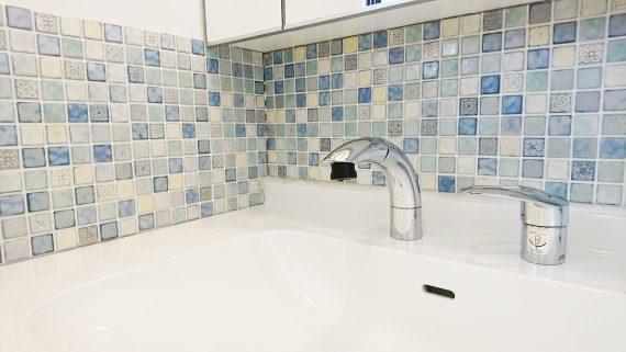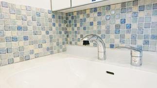 壁の一部にブルー系のモザイクタイルを貼り素敵なアクセントになっています。