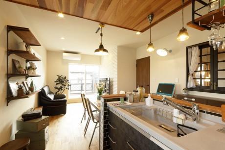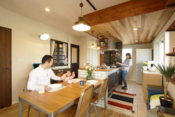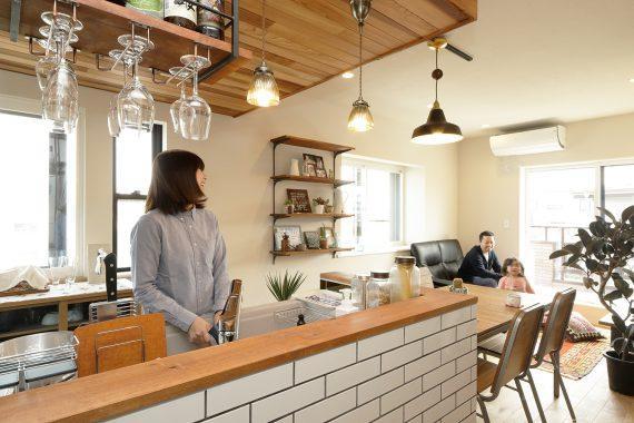 天井にはレッドシダーをランダムに貼ることによってラフ感を出し、カフェのような雰囲気を演出。ブルックリンスタイルでは一部にN.Yの地下鉄に駅に使われるサブウェイタイルを使うことが多いのでキッチンの腰壁に使用。白さが作り出す清潔感と伝統を感じさせる素材を使うことでトラディショナル感が空間をキリッと引き締めてくれます。キッチンの木製の吊り棚の下にはワイングラスを引掛けるアイアン金具を設置し、カフェバーの雰囲気に。