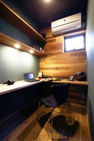 もともとあった外との出入口は明り取りの小窓に変更し、ご主人のお好みで空間全体を落ち着いたダーク系でコーディネイトしました。照明はシンプルに棚に埋め込み型のダウンライトを採用。ネット環境も整えました。