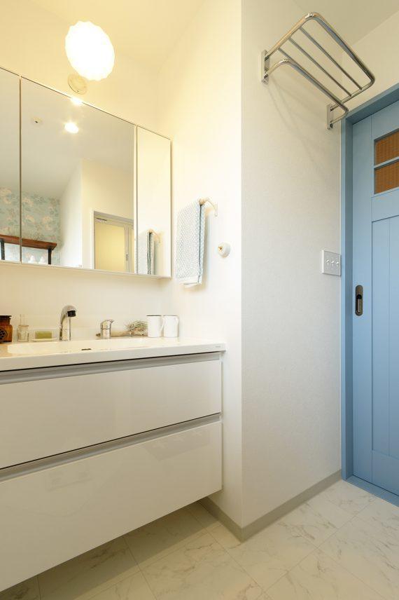 鮮やかな青い扉にシンプルで収納ができる洗面化粧台を設置。爽やかさと清潔感を演出ました。