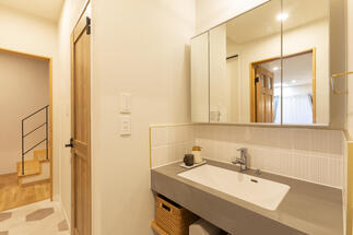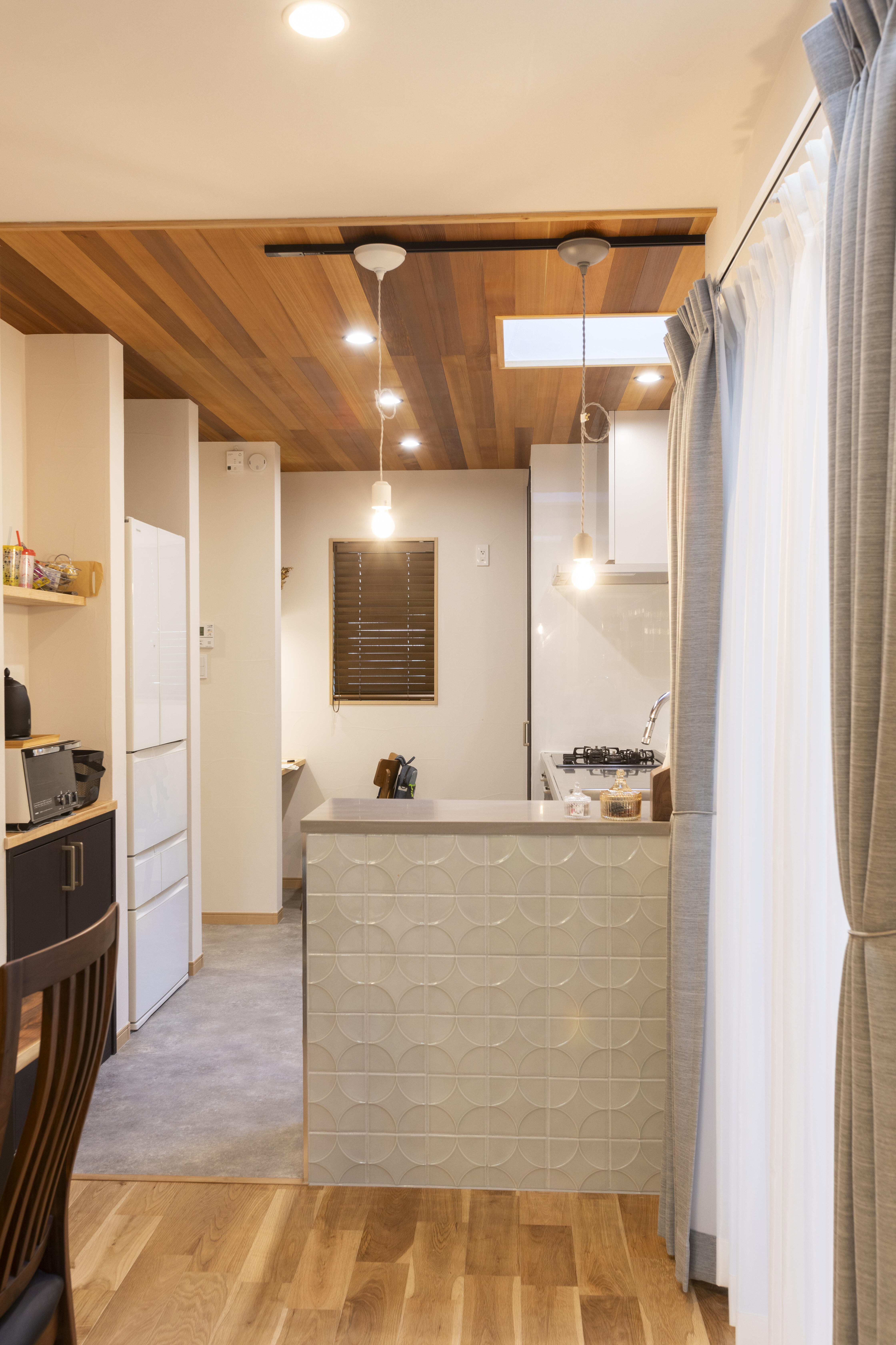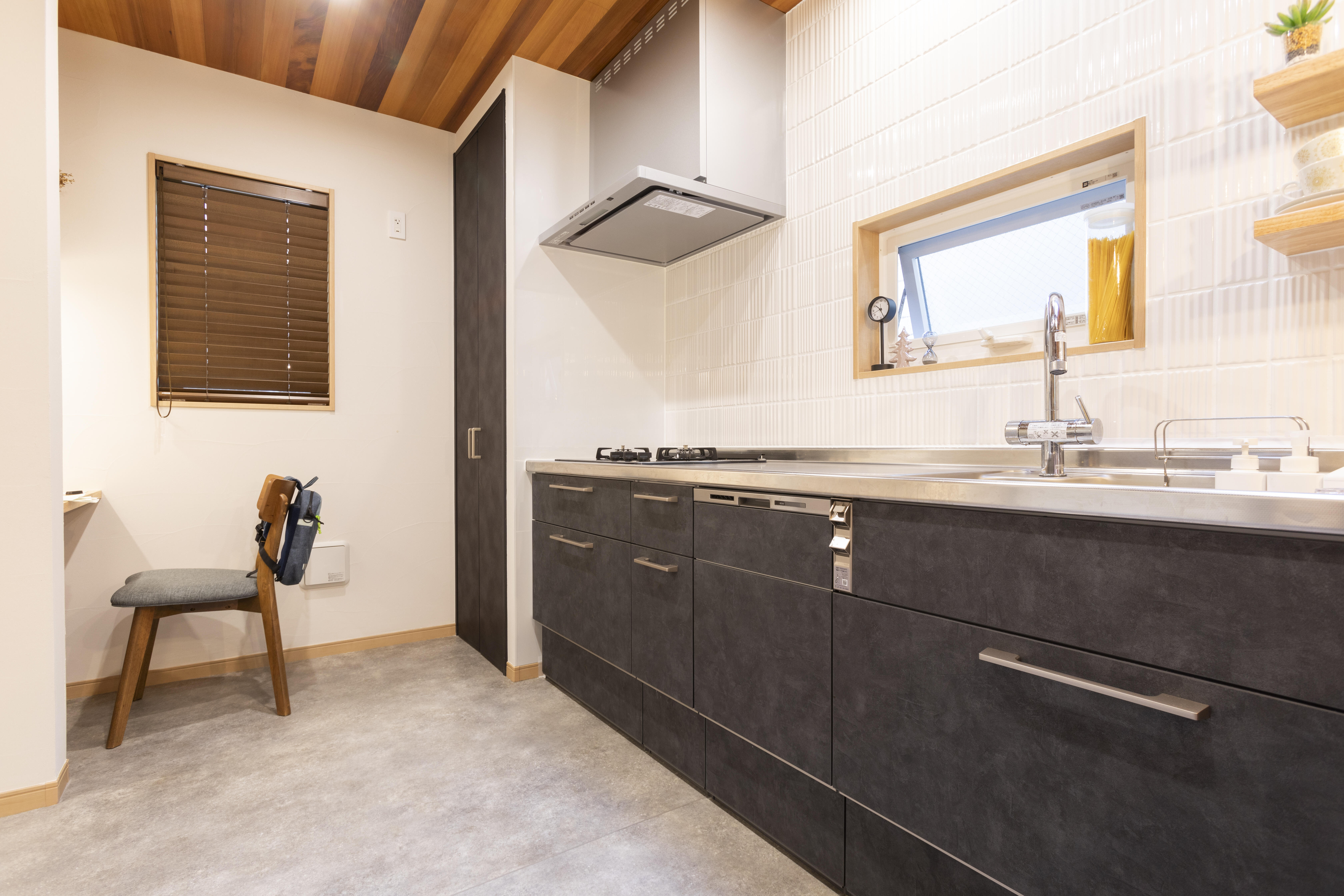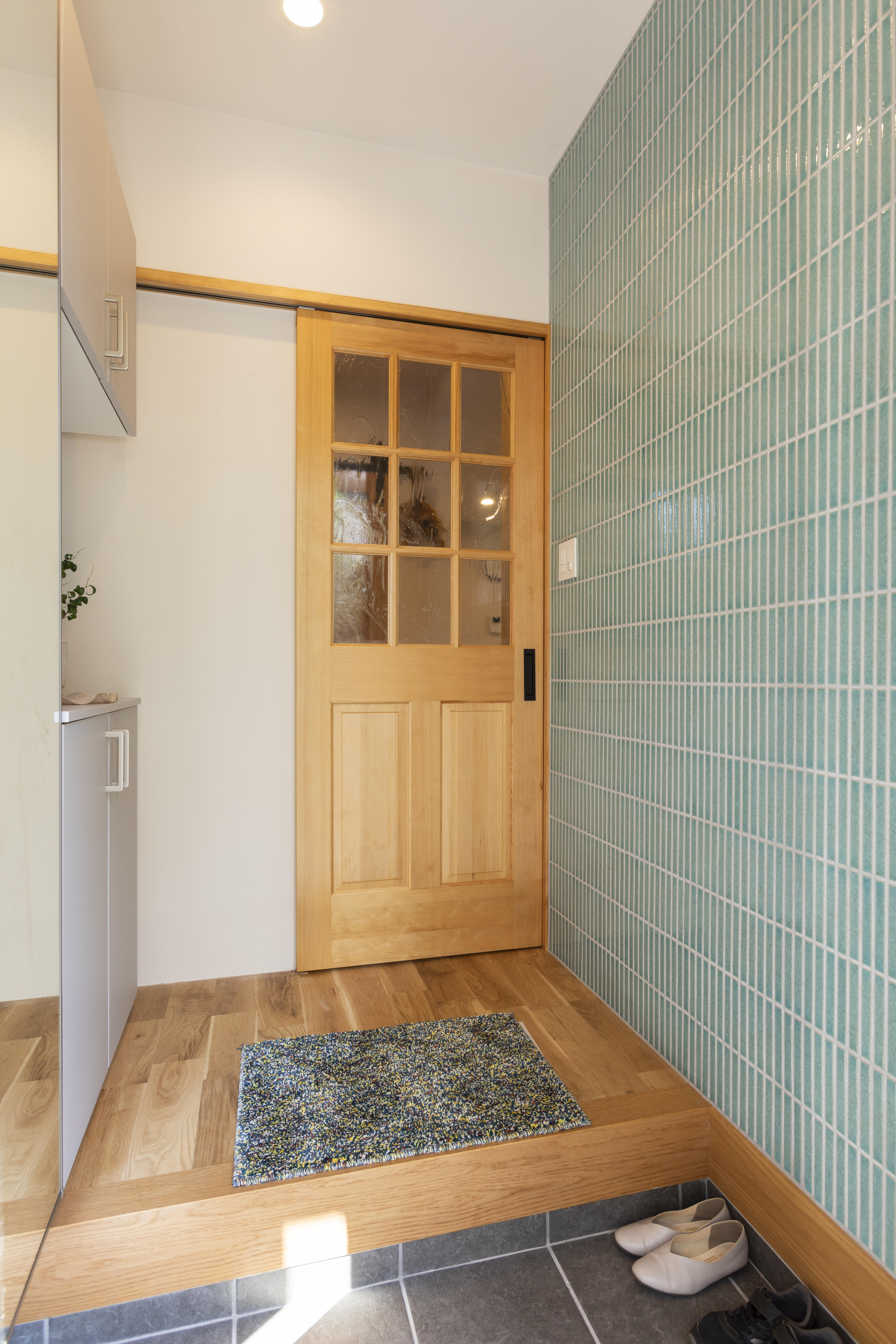 弊社の事務所やモデルハウスのデザインを気に入っていただき、タイル、建具、レッドシダー、格子、外壁材など、同じ仕上げ仕様を積極的に採用していただきました。キッチンや洗面所にもタイルを多く取り入れて、とても素敵な仕上がりとなりました。