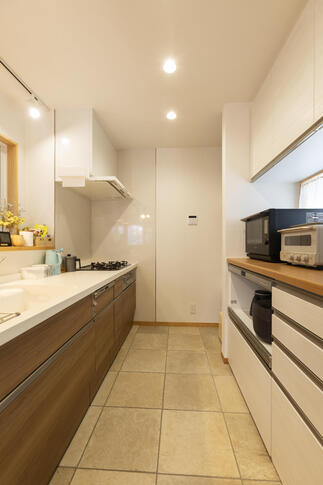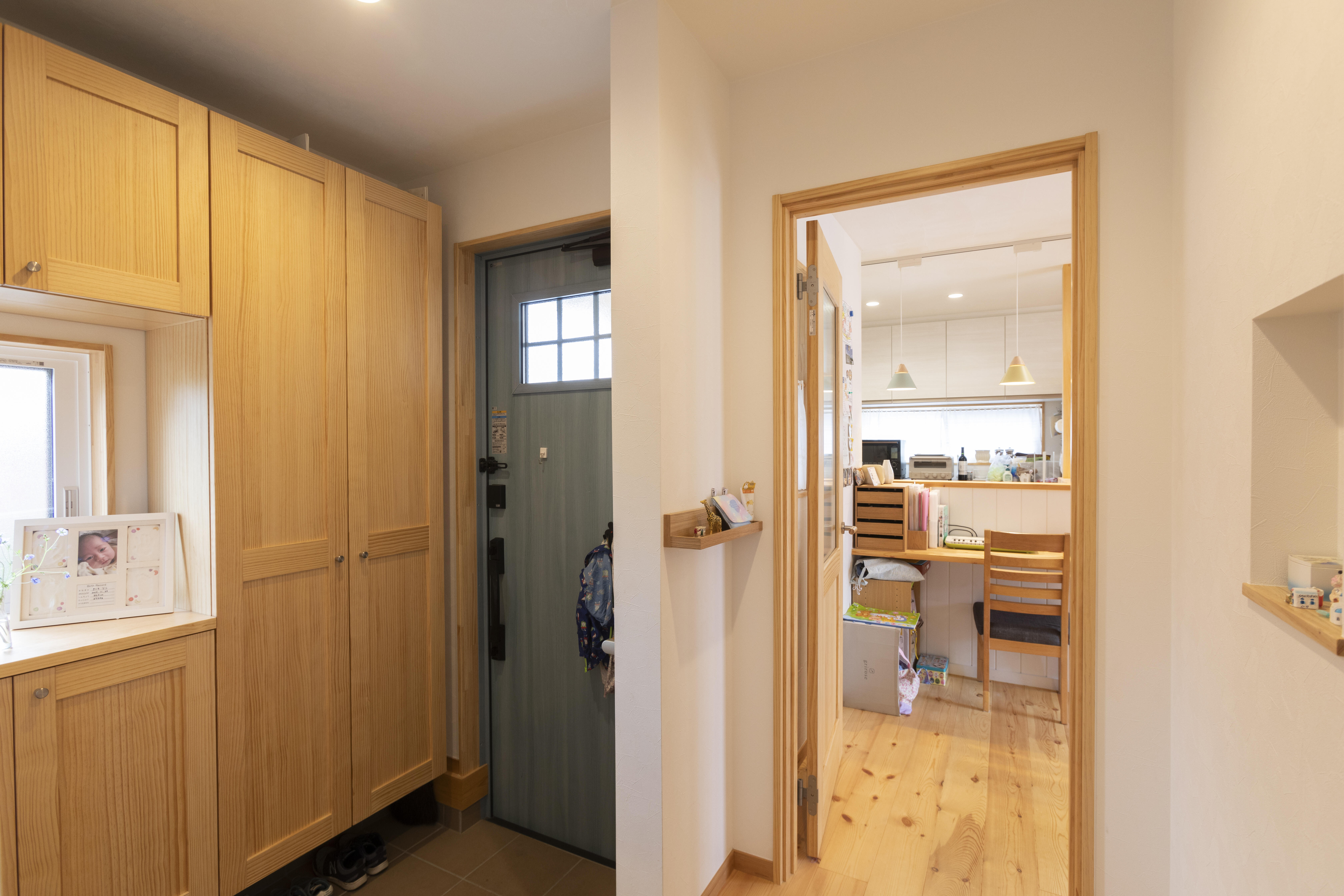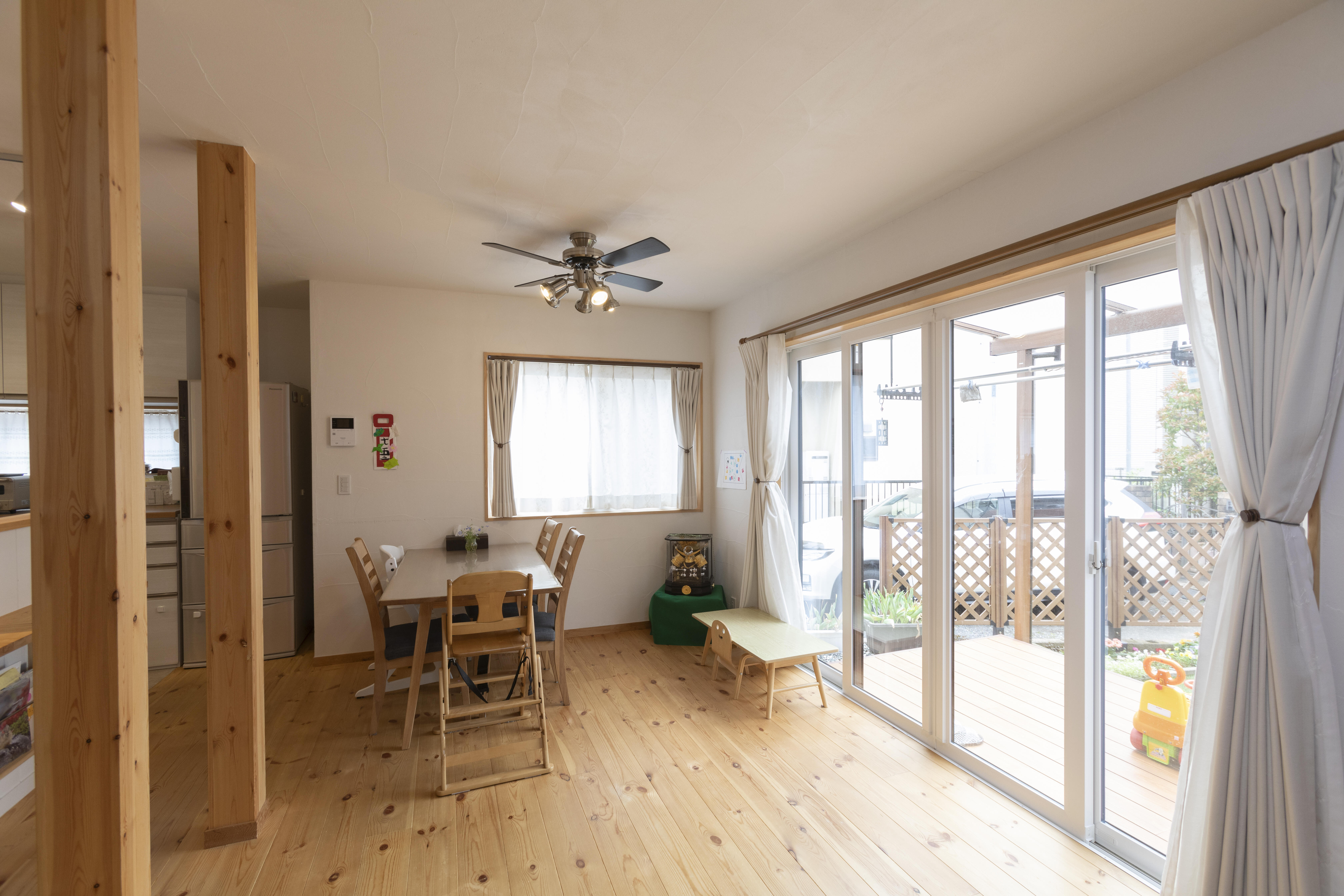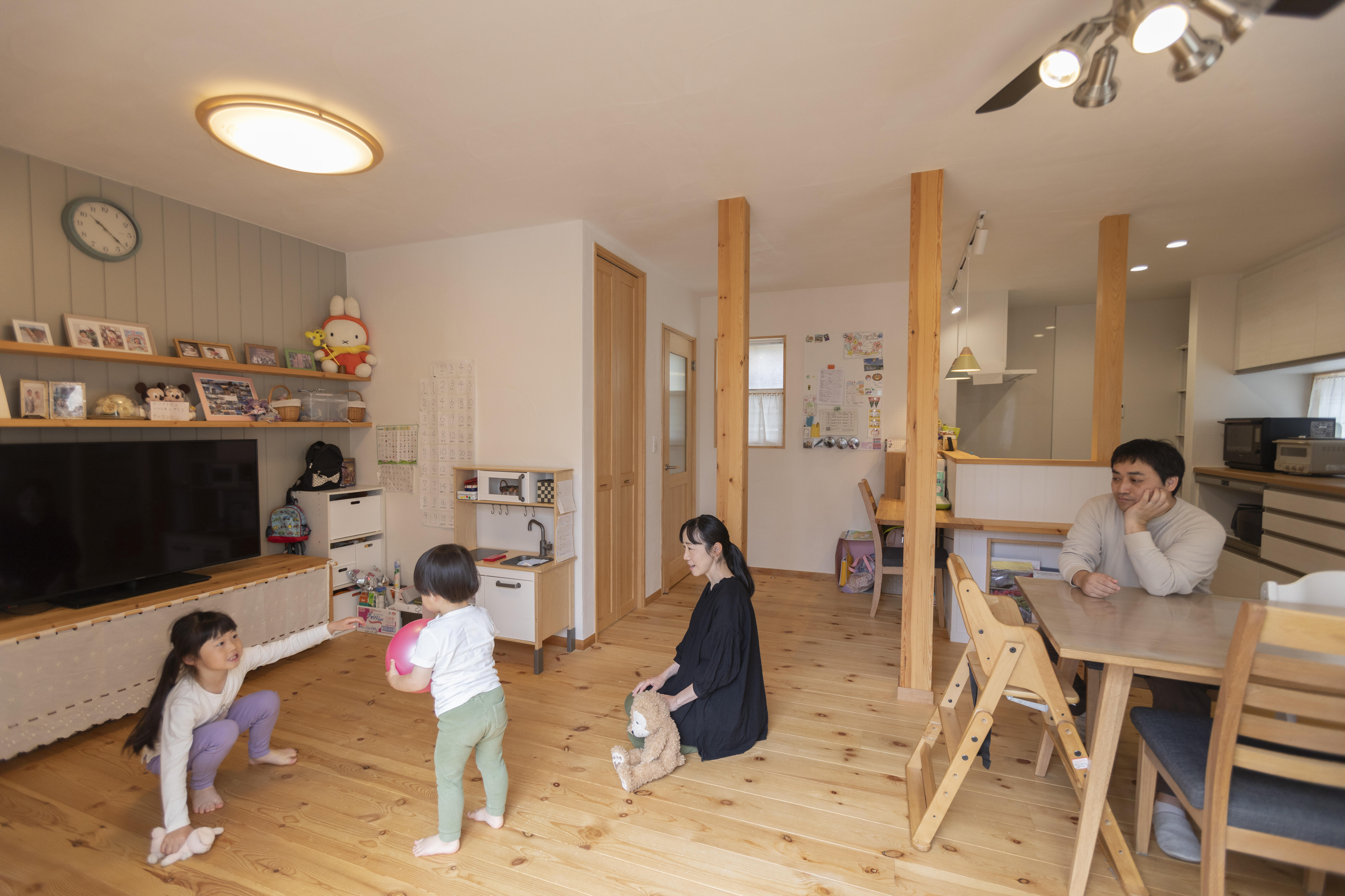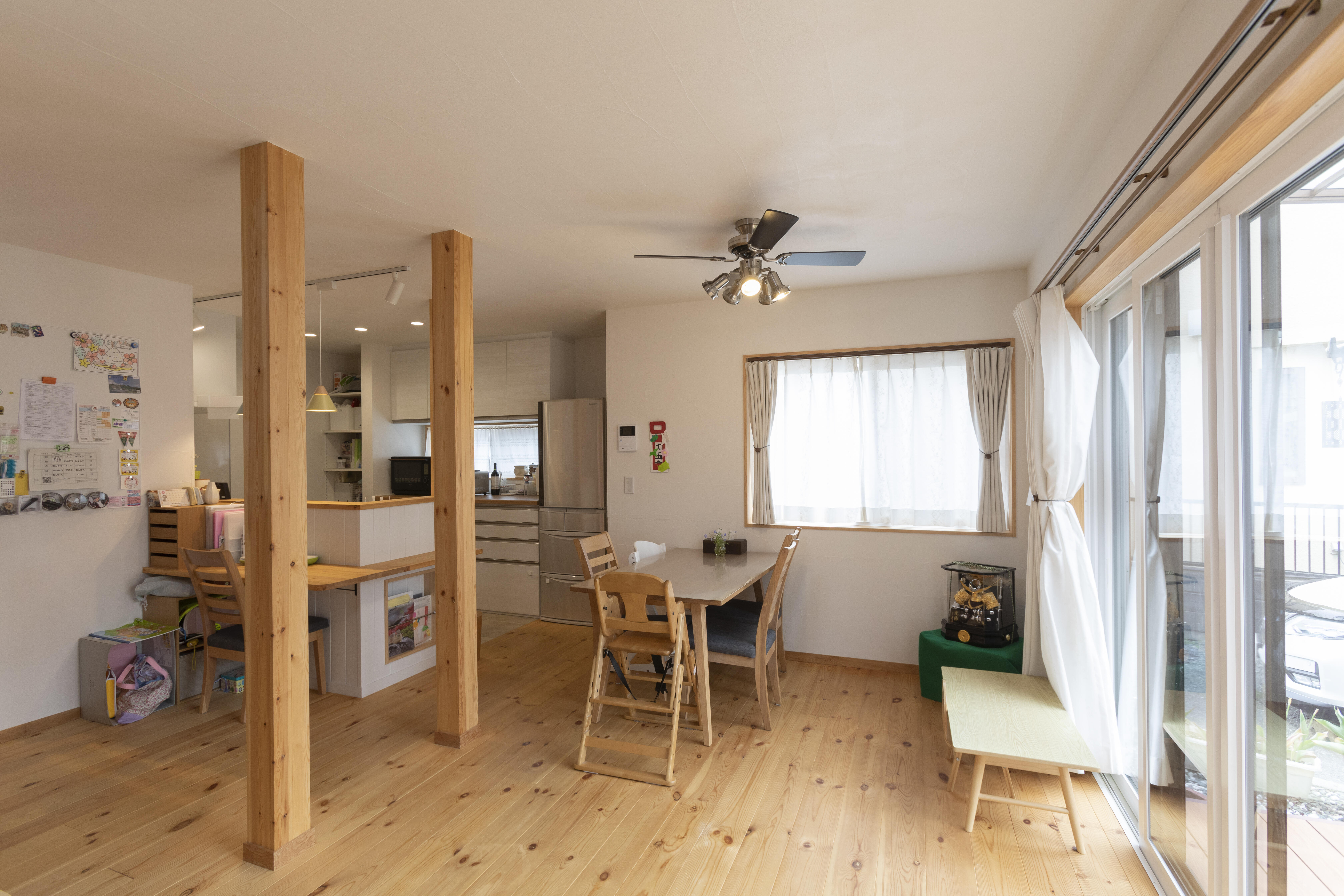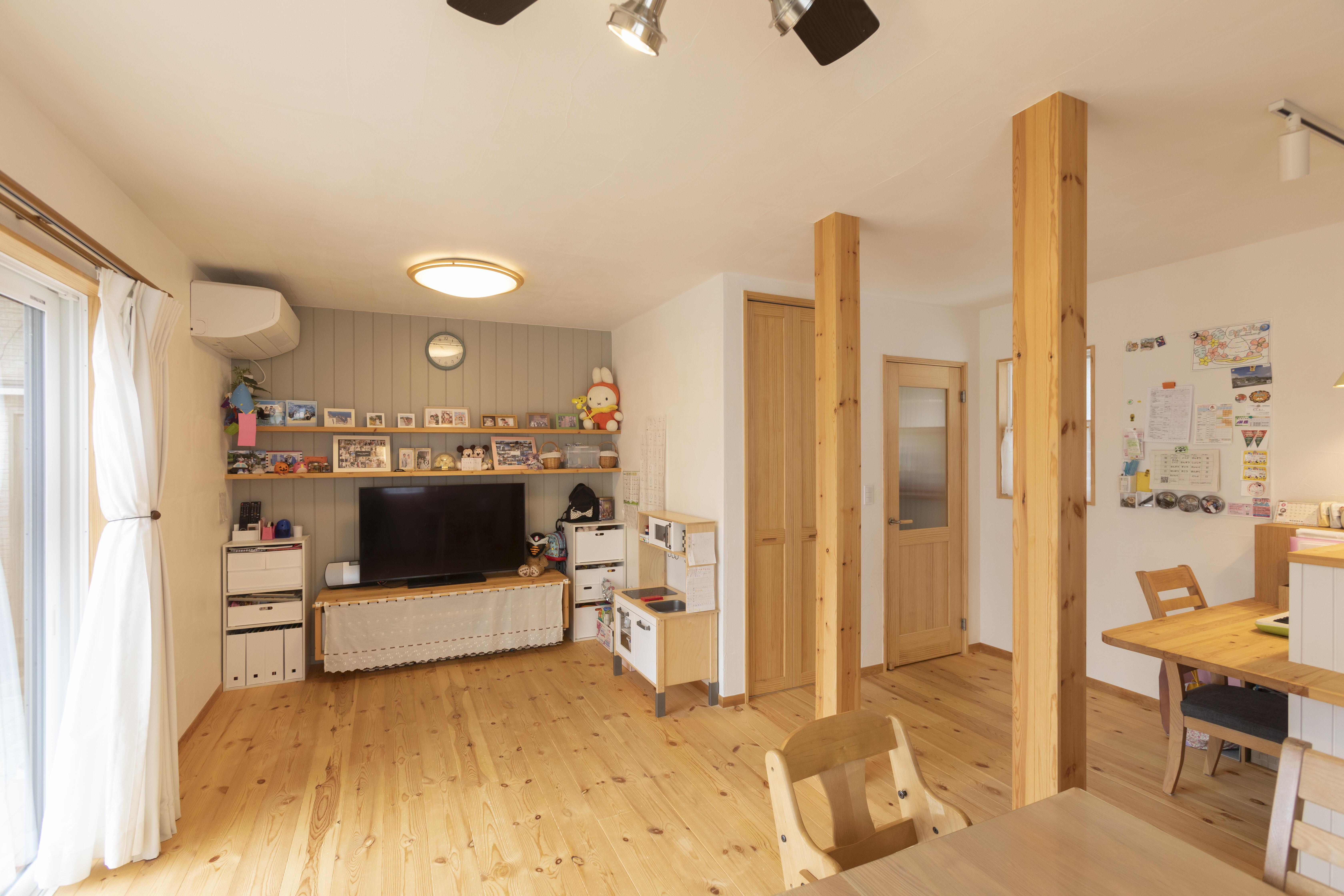 無垢の床、漆喰の壁と自然素材を多く取り入れた、明るく木のぬくもりを感じられる住まいに生まれ変わりました。 リビングをより良い空間にするため、厚み3㎝のパイン材を床に使用しました。 完成してから伺った際に、お子様がリビングで寝転んだり裸足で駆け回っている姿を見て、心地の良い空間になっていることがよく分かりました。 お子様の成長と共に自然素材の変化も楽しんでいただけたら嬉しいです。