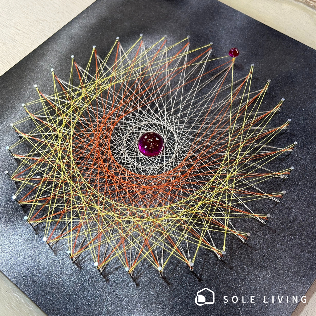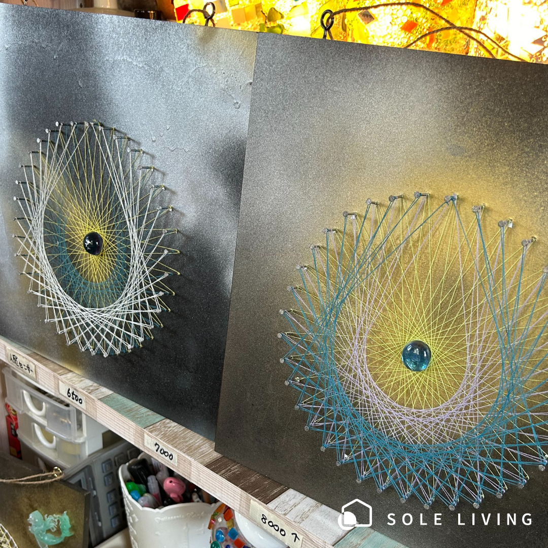 釘の間に糸を掛けて絵やデザインを描く立体感のあるウォールアートです。