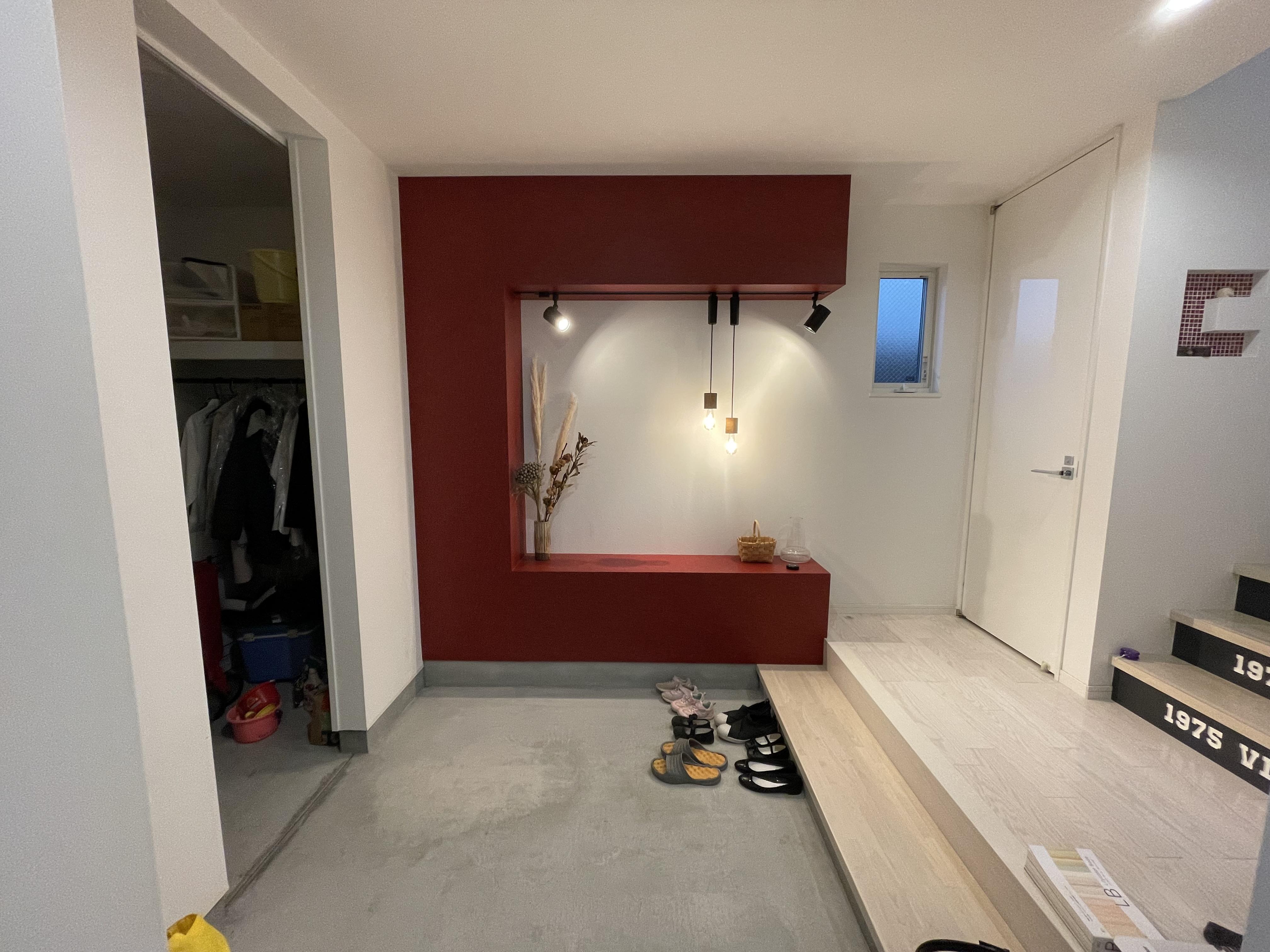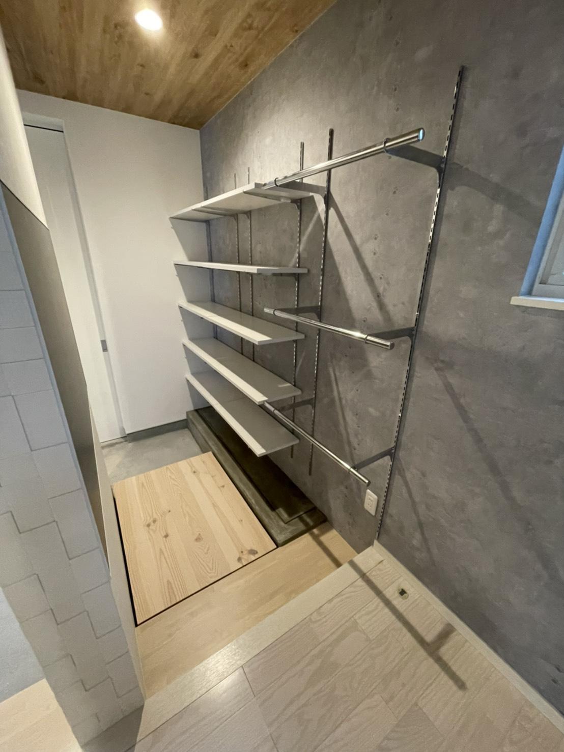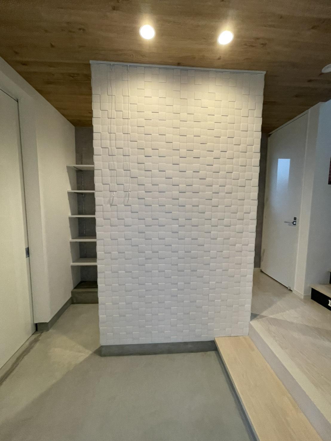 広い玄関を仕切り 棚・ハンガーパイプ取付 玄関から入っての重厚感あるエコカラット張の壁で SICの中も見えず スッキリ 天井の木風のクロスがさらに落ち着きを出しています。
