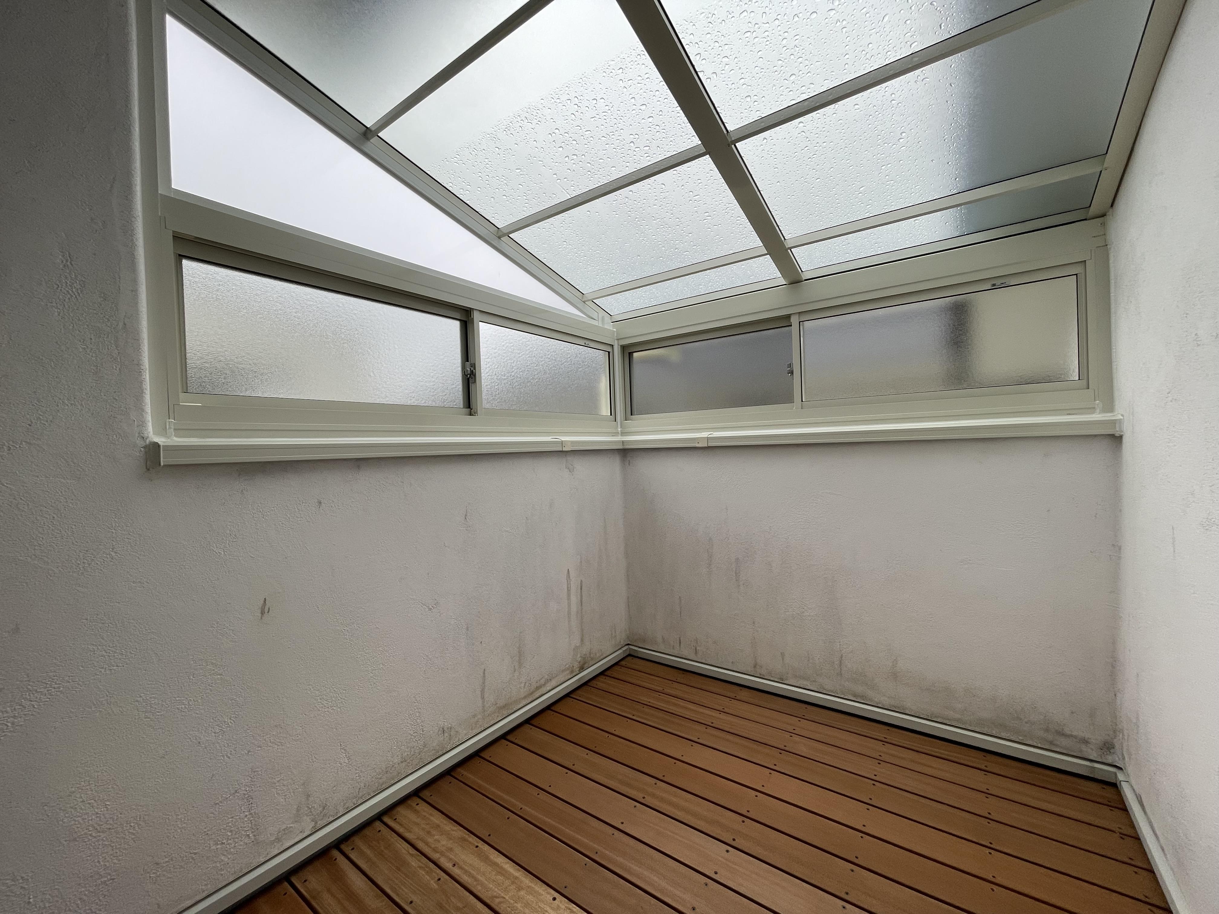 屋根のないバルコニーをサンルームに改装。 床もウッドデッキにし。コンセント・照明も増設し 完璧なランドリールームに。
