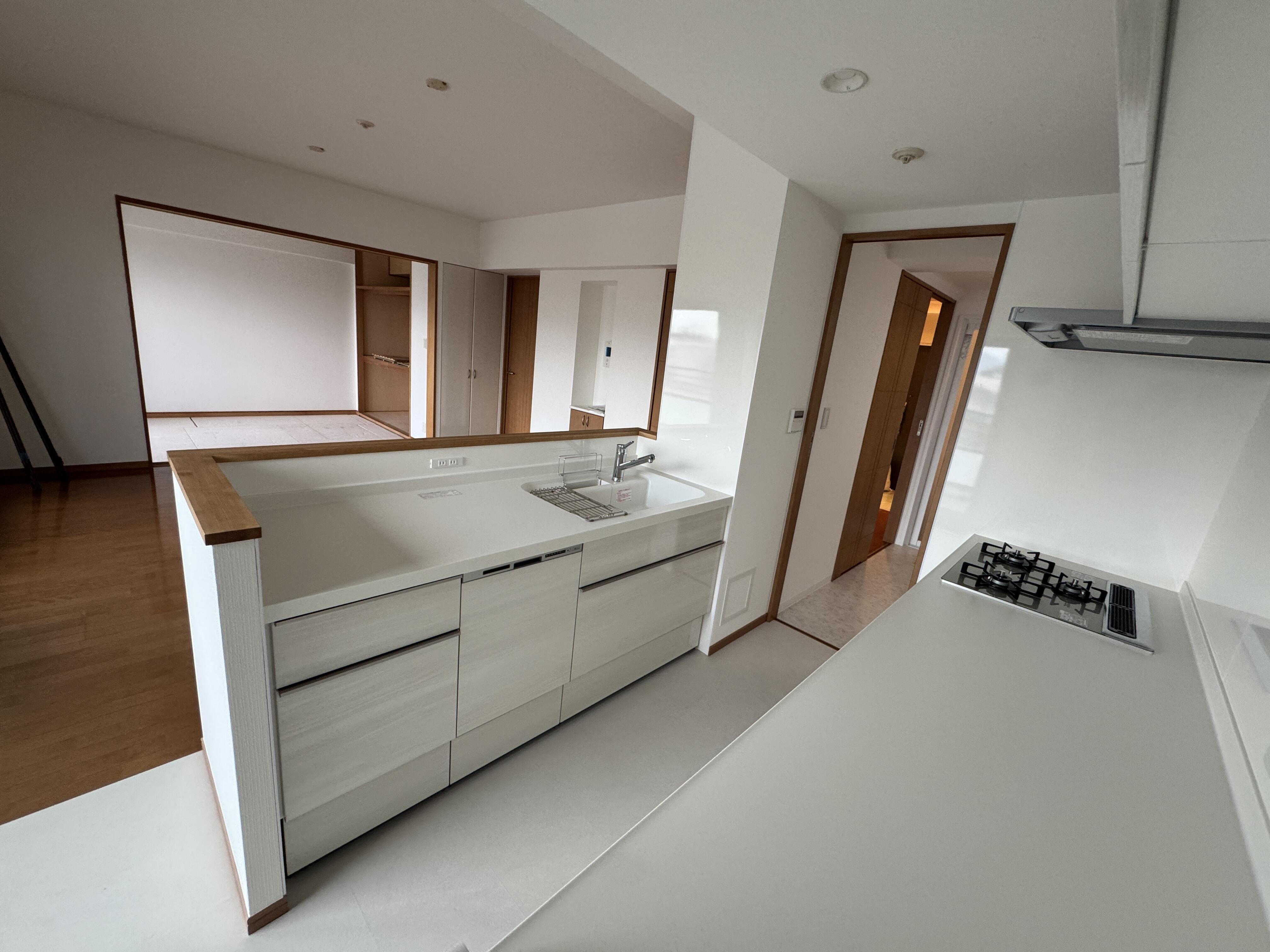 マンションですが 床組してある物件だったので 壁付けキッチンからⅡ型 キッチンに変更できました。 施主様の希望がかなえられてよかったです。