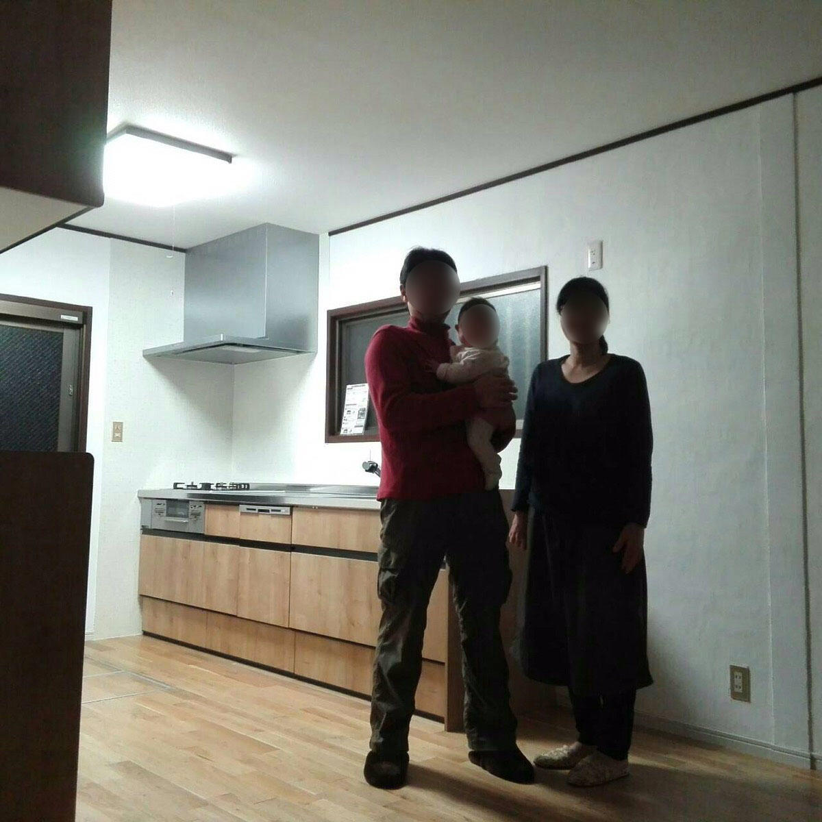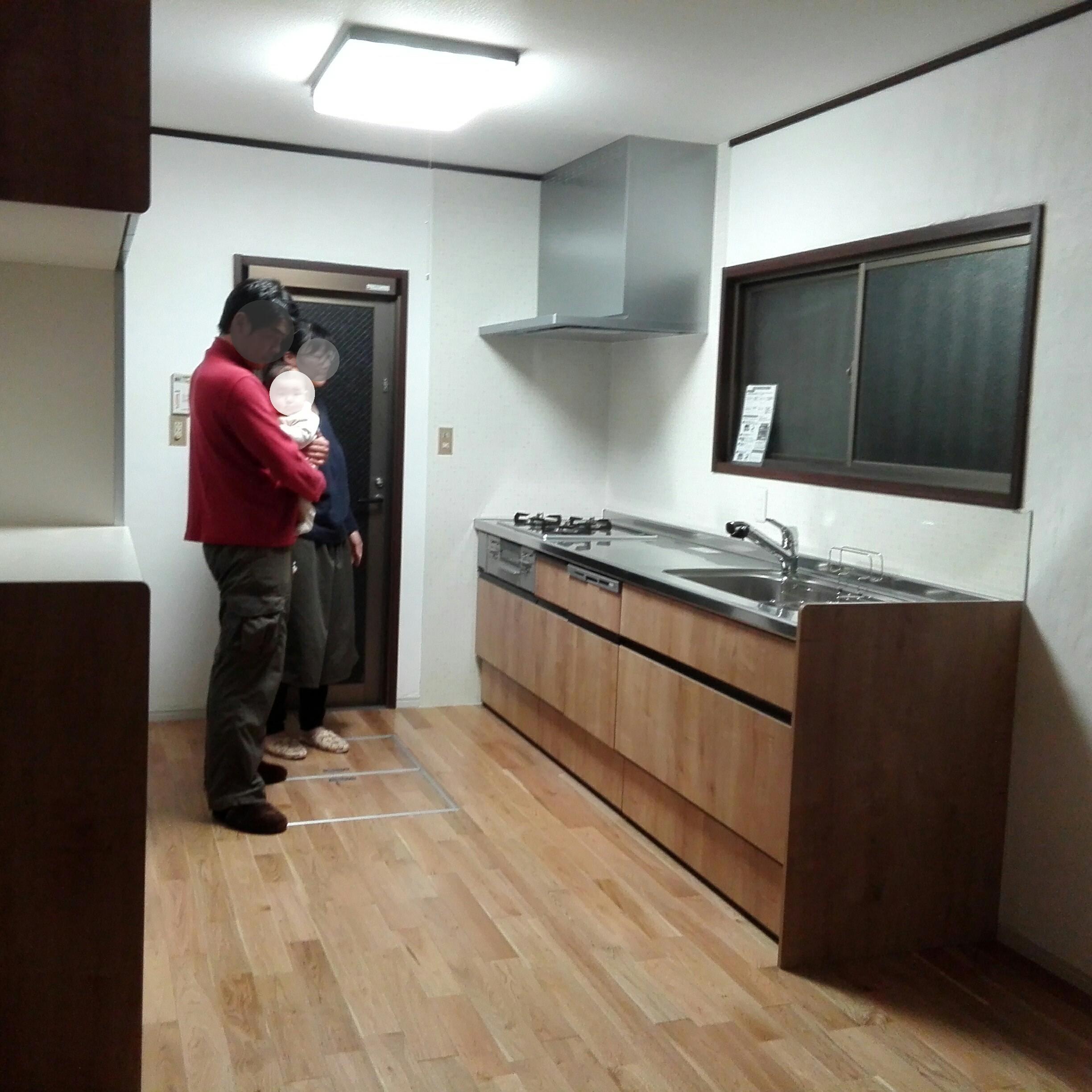 秋に赤ちゃんが産まれて、明るくOPENなキッチンにリフォームをされました。 きっかけは、お台所の水漏れでしたが、根太から入れ替えをして天然木の明るいクルミの床材に張替、腐ってしまった古いシステムキッチンも、明るい木目のアレスタのシステムキッチンに入れ替えました。 背後には大きな大容量の食器収納に使いやすい家電収納を設置しました。 収納が増え、とても使いやすいと喜んでいただけました。 壁はしっくい壁をお友達と塗っていただいて、温かみのあるお部屋に仕上がりました