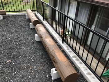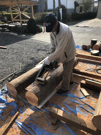 古い建物の解体の丸太を再利用♪自然な風合いをそのままに存在感のあるベンチができました!