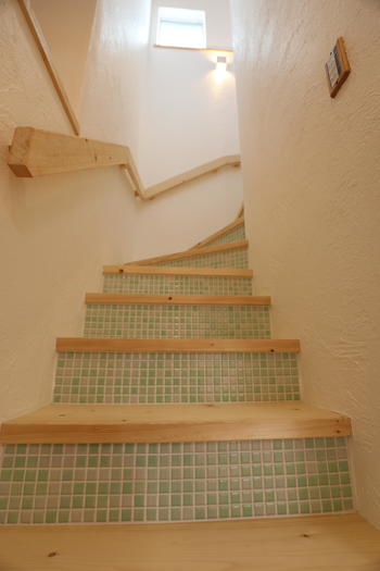 木と漆喰の可愛らしいこの階段、アクセントでタイルが使われているんです!