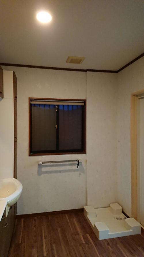 洗面脱衣室入り口ドアを望む。洗面脱衣室は、1)天井・壁:『クロスの貼り替え』2)床: 『クッションフロアの貼り替え』を致しました。
