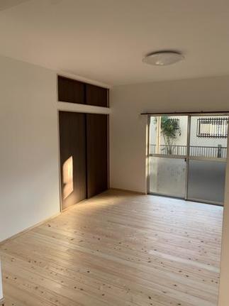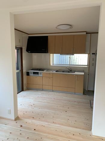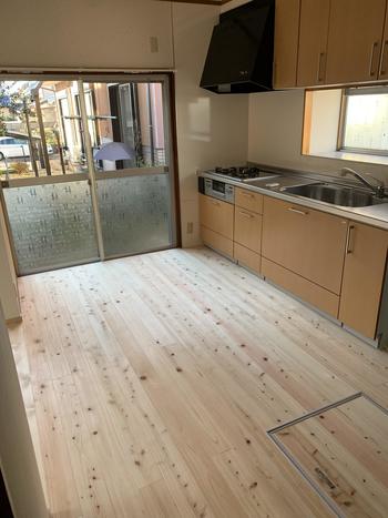 とても明るいキッチンになりました。料理も楽しく準備して頂けます!ひのきの床が足元をやさしく包んで見た目もやさしい印象に リビングでゆったりする時間をお過ごしくださいね♪