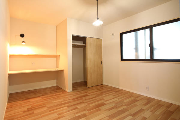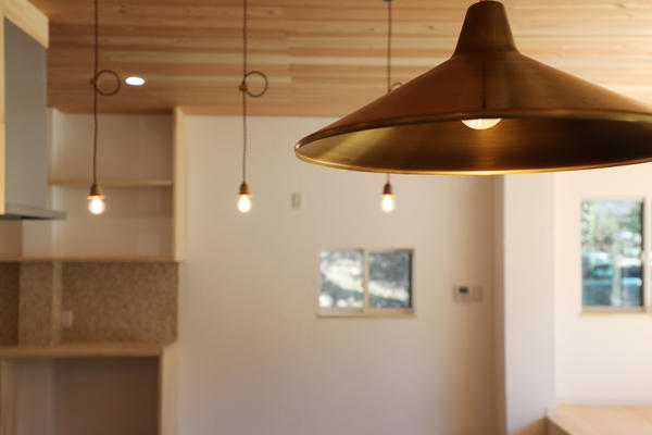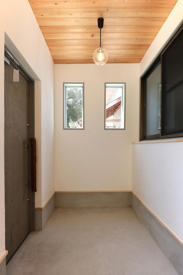 二つの小窓が明り取りになっています。おしゃれな照明が無垢の天井に映えます。