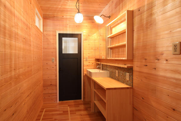 木の香りいっぱいの洗面所になりました。上部に明り取りの小窓を設けてあります。
