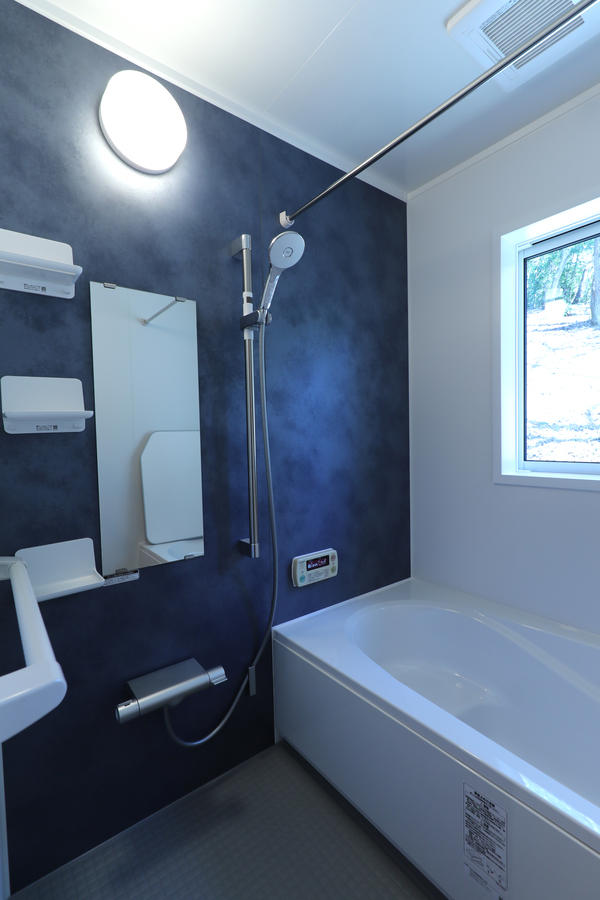 バスルームは、『リデア』を使用しています。アクセントパネルがきいています。(壁面の棚はマグネットになっています。)