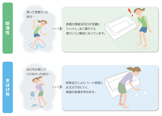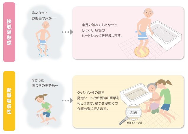 バスナフローレは、これまでの浴室床材と一線を画したやわらかいクッション性を