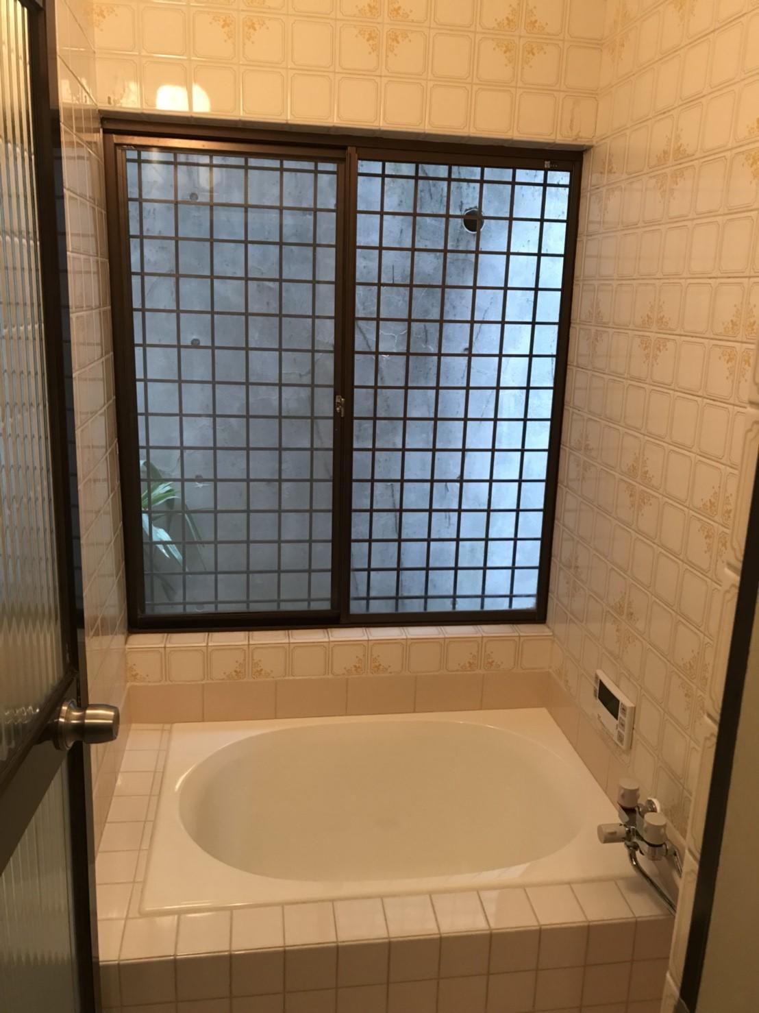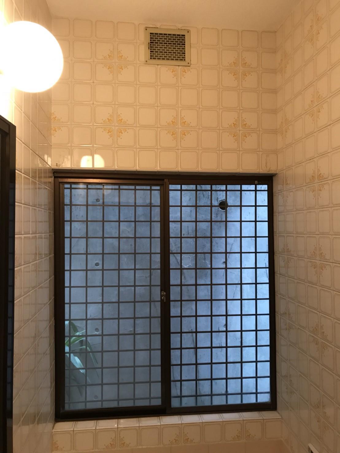 お風呂の大きな窓にタイルと雰囲気を合わせたLIXILのアルミ面格子、井桁を取り付け。