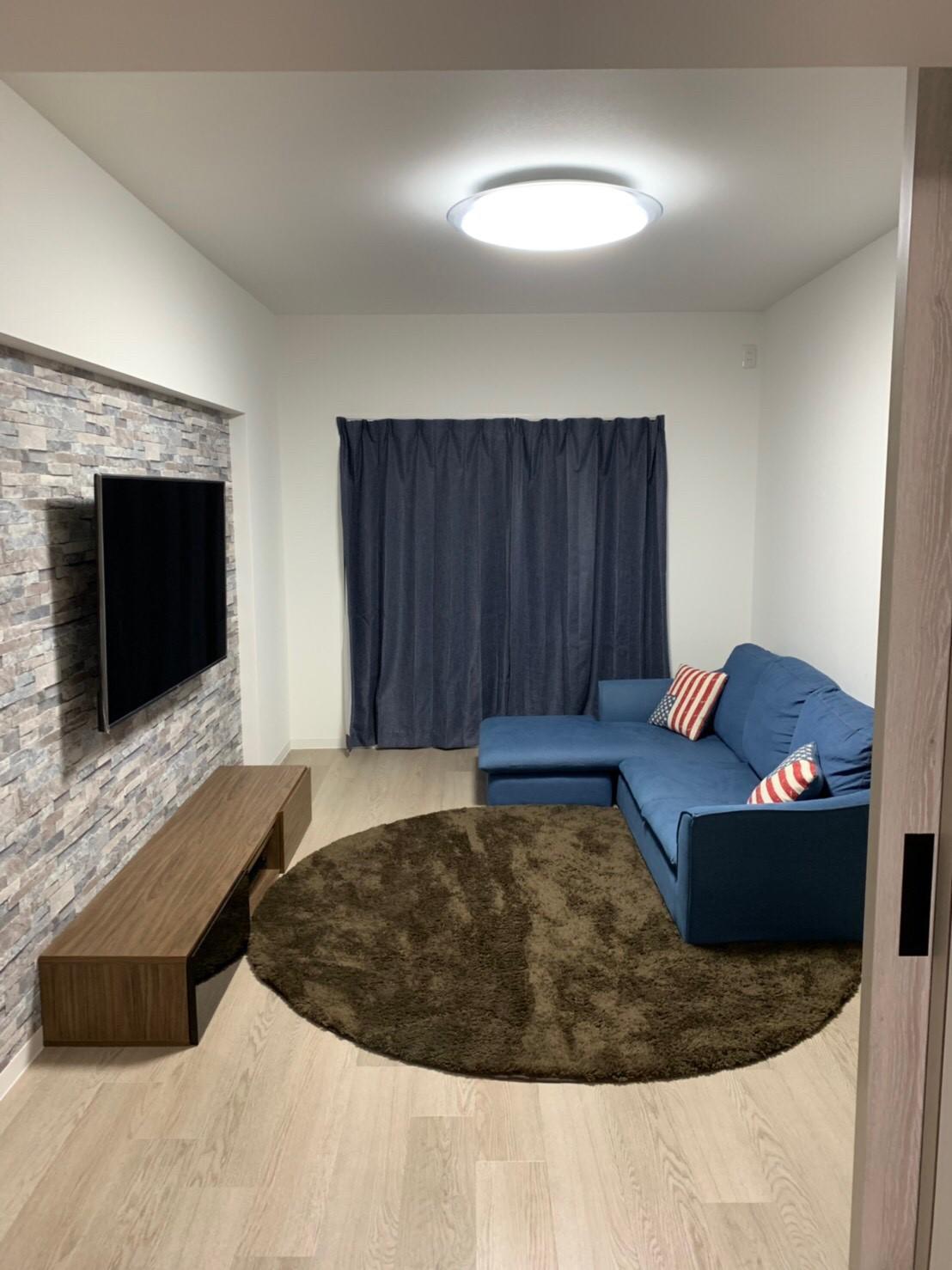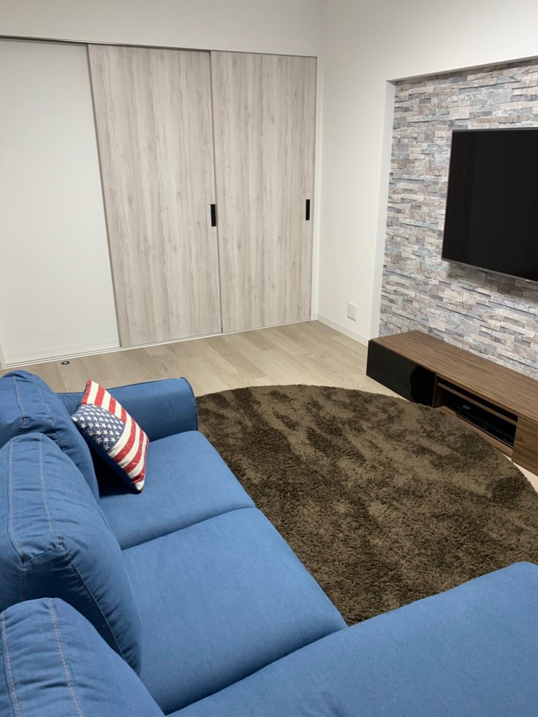 壁掛けテレビを設置するには少し奥行きを付けてアクセントクロスを♬キッチンとの間には間仕切り扉を付けました。