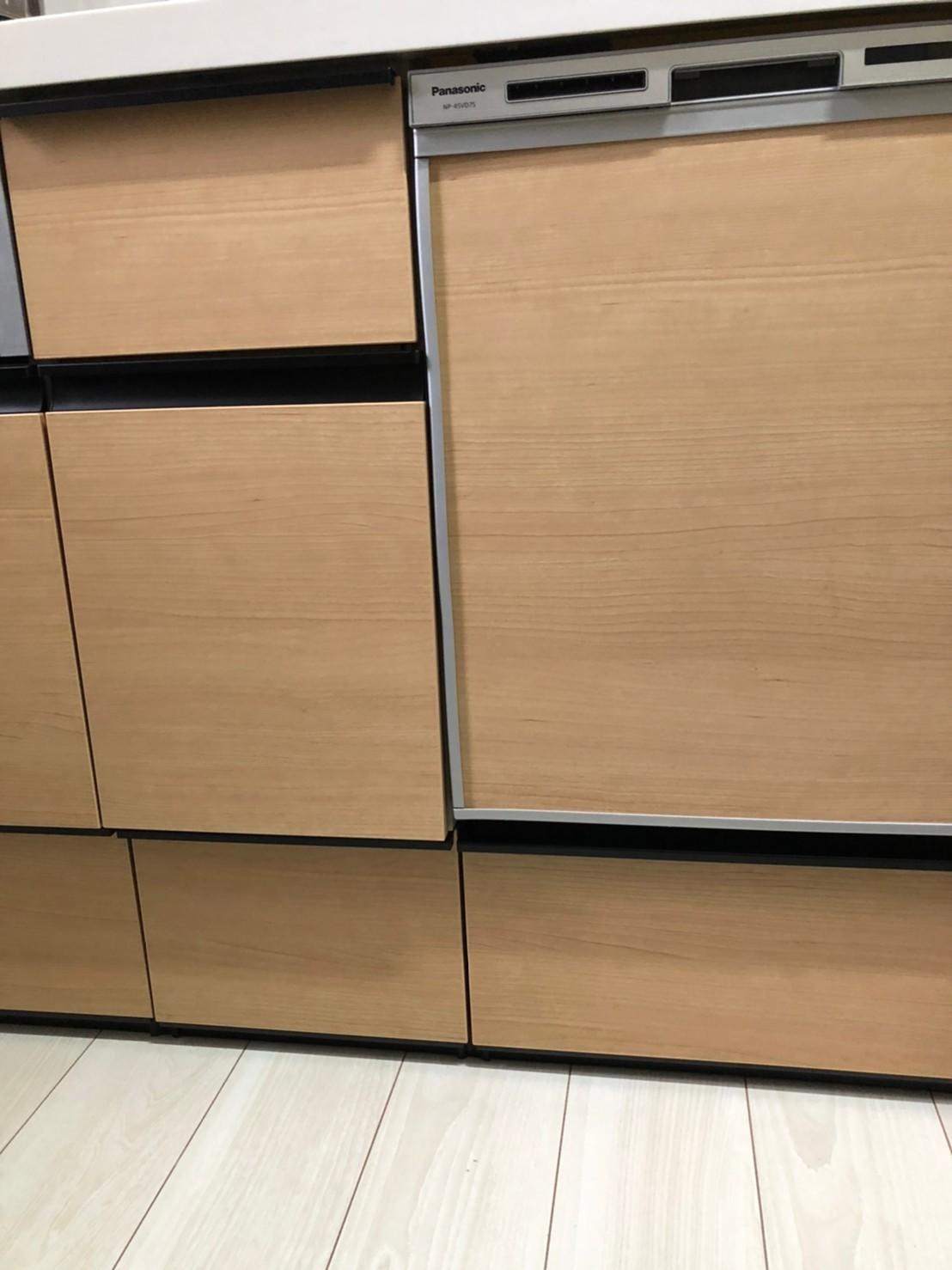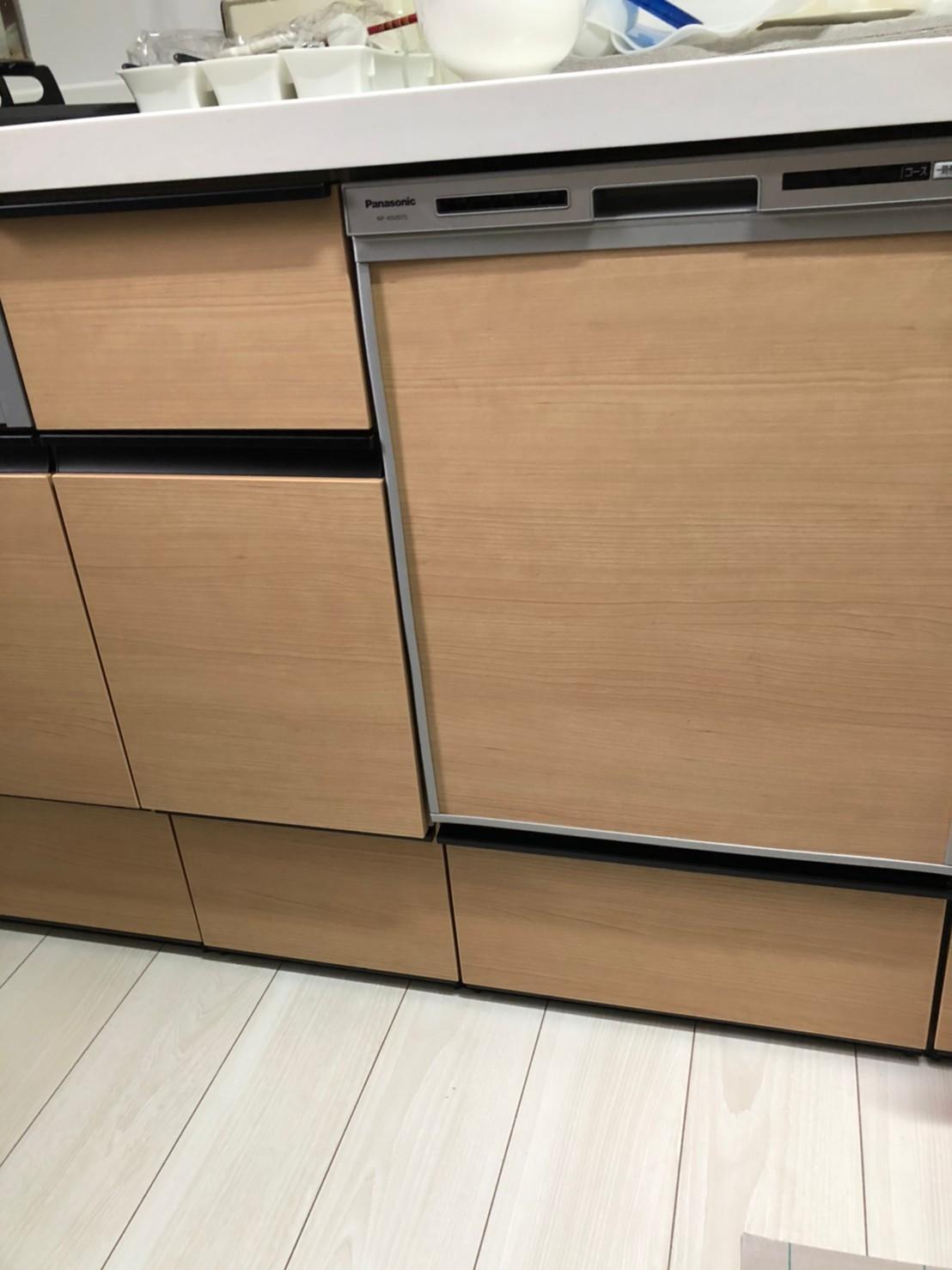 付随工事として食洗器専用回路が必要なため、電気工事や食洗器下キャビネットとの接続金具などが必要です。 また取付条件などもありますが、今回はお施主様の希望されていた食洗器以外のスペースは収納としての利用、面材はキッチンと同じものを施工することが出来ましたので喜んでいただけました。