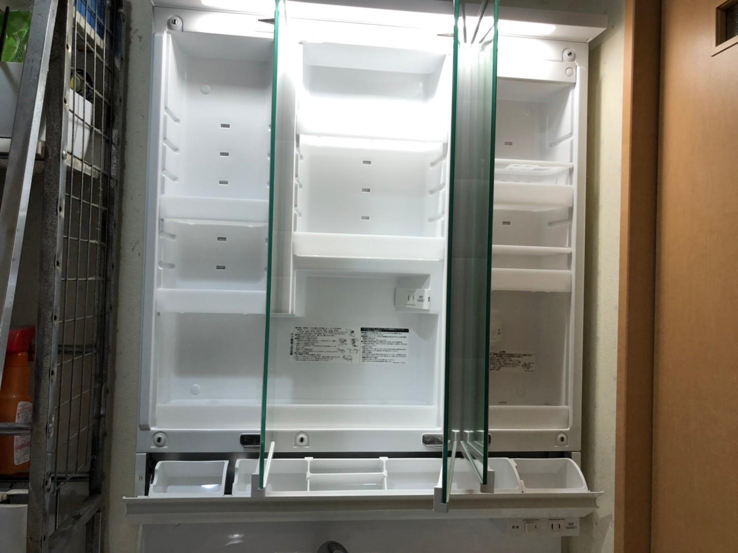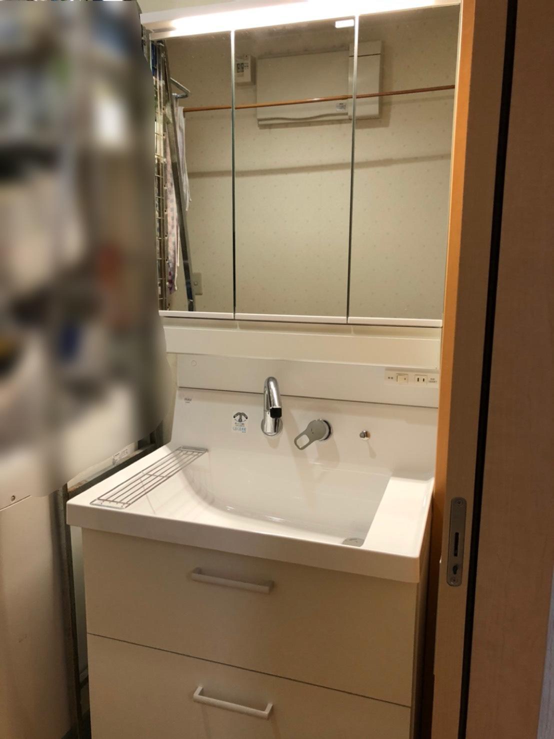 水栓から水漏れが起きたことをきっかけにご来店頂き、工事をさせて頂きました。 様々なメーカーの商品をご提案させて頂きましたが コンセント差込口が3つ(外に1つ、3面鏡内に2つ)あり、収納力がある LIXILのピアラに決定致しました。