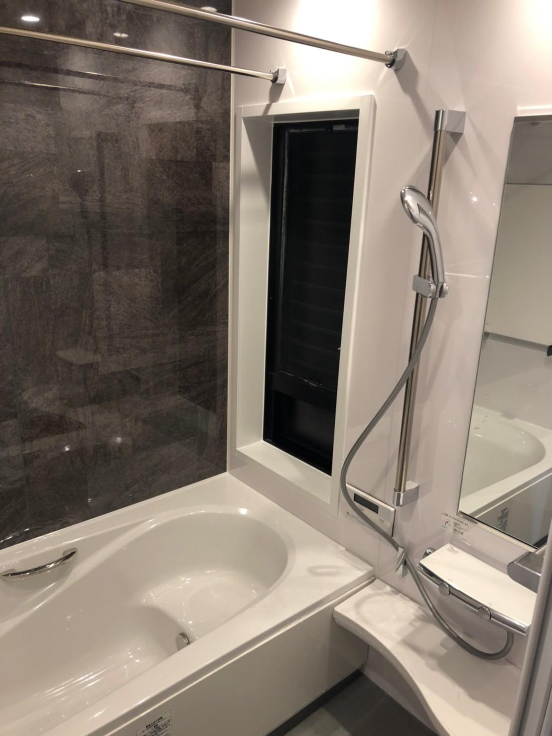 お風呂はパネルに組石グレーを採用し、シックな雰囲気に。 エコベンチ浴槽で使用水量を抑制し家計にもグッドな選択をしました。
