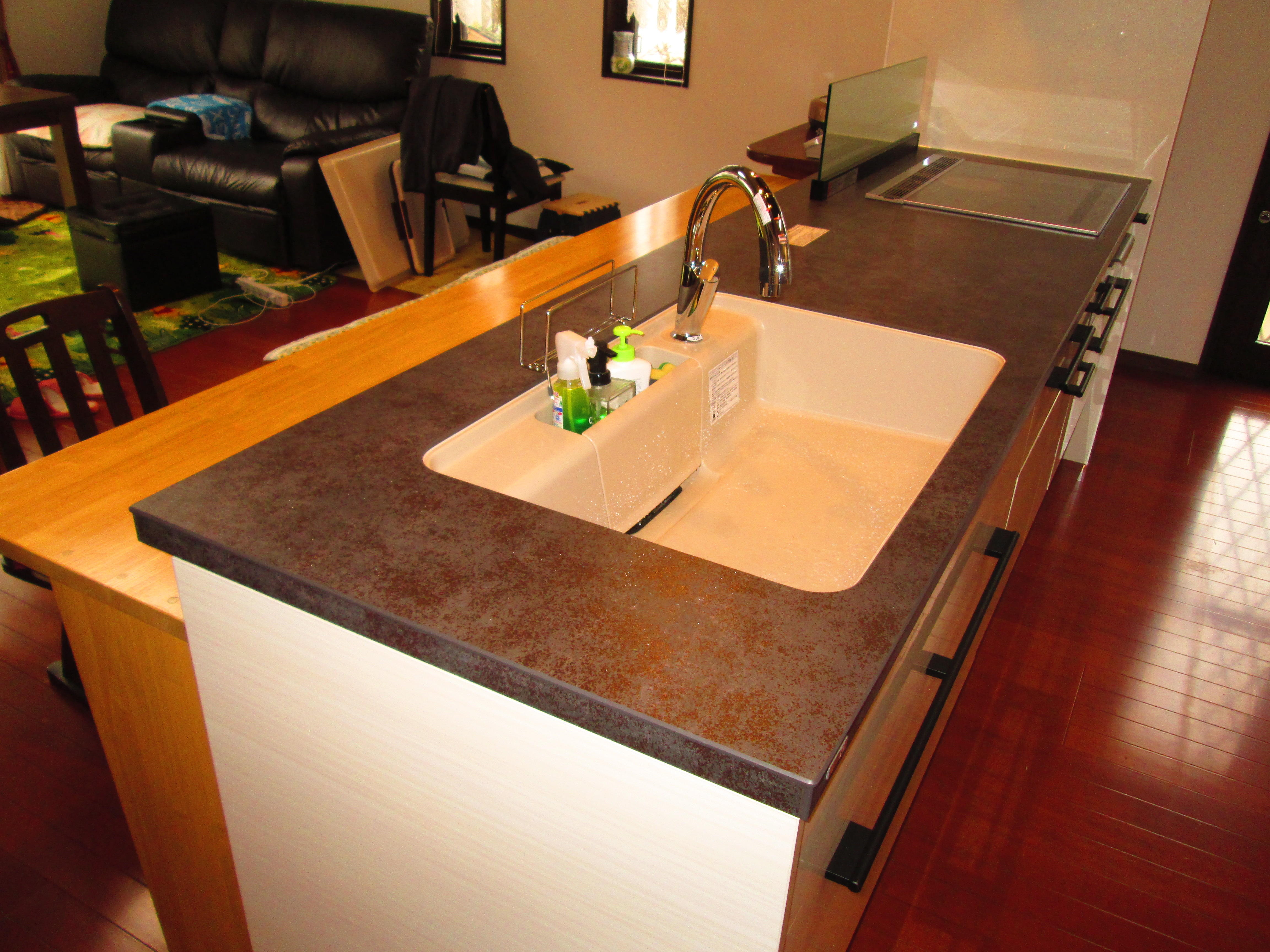 ショールームでリシェルをみて気に入っていただきました。もともとロータイプのカウンター設置のご相談だったので、造作のカウンターをセットしました。取り除けなかった体力壁は、上部は収納に、下部はごみ箱の収納になりました。