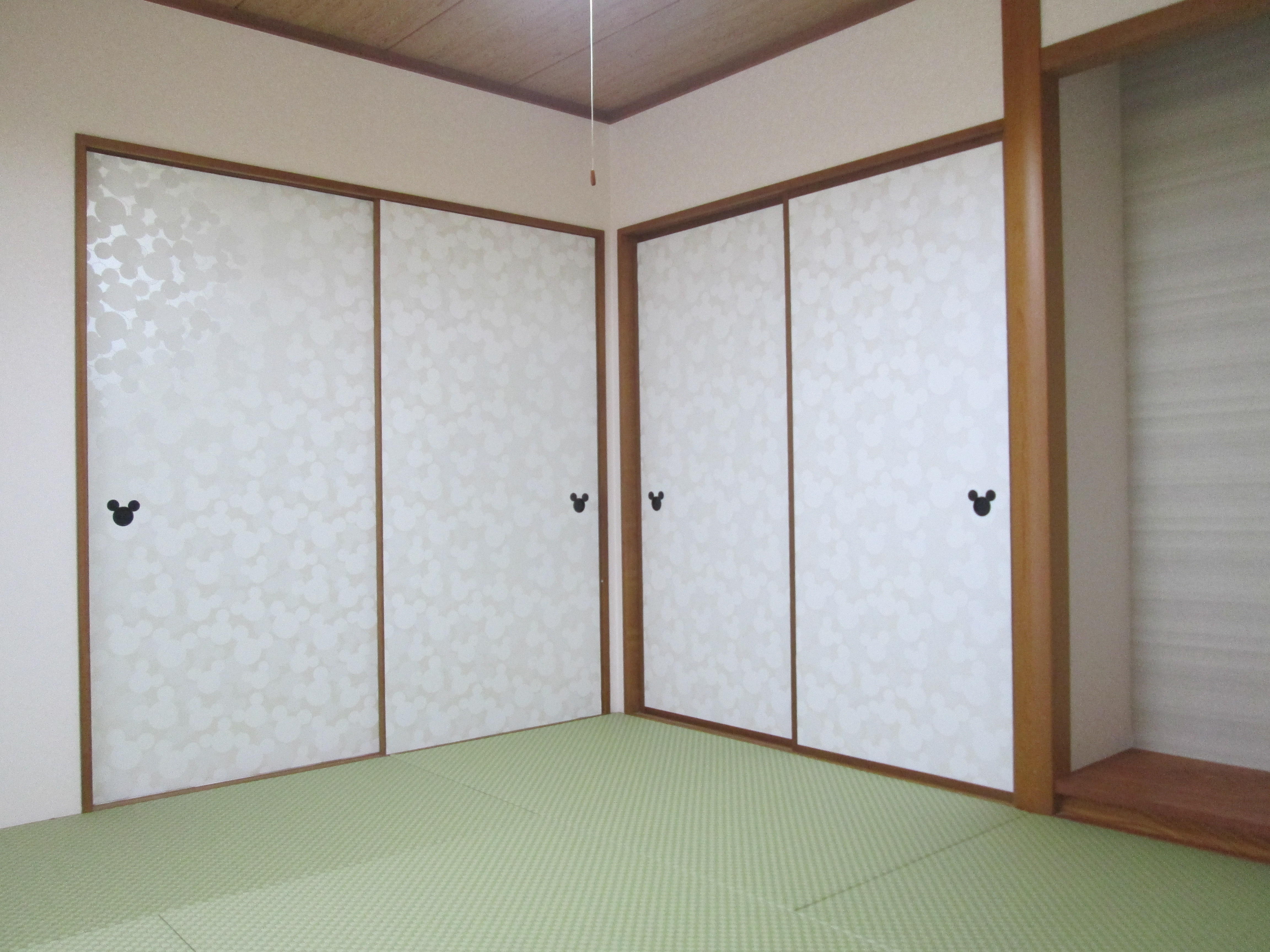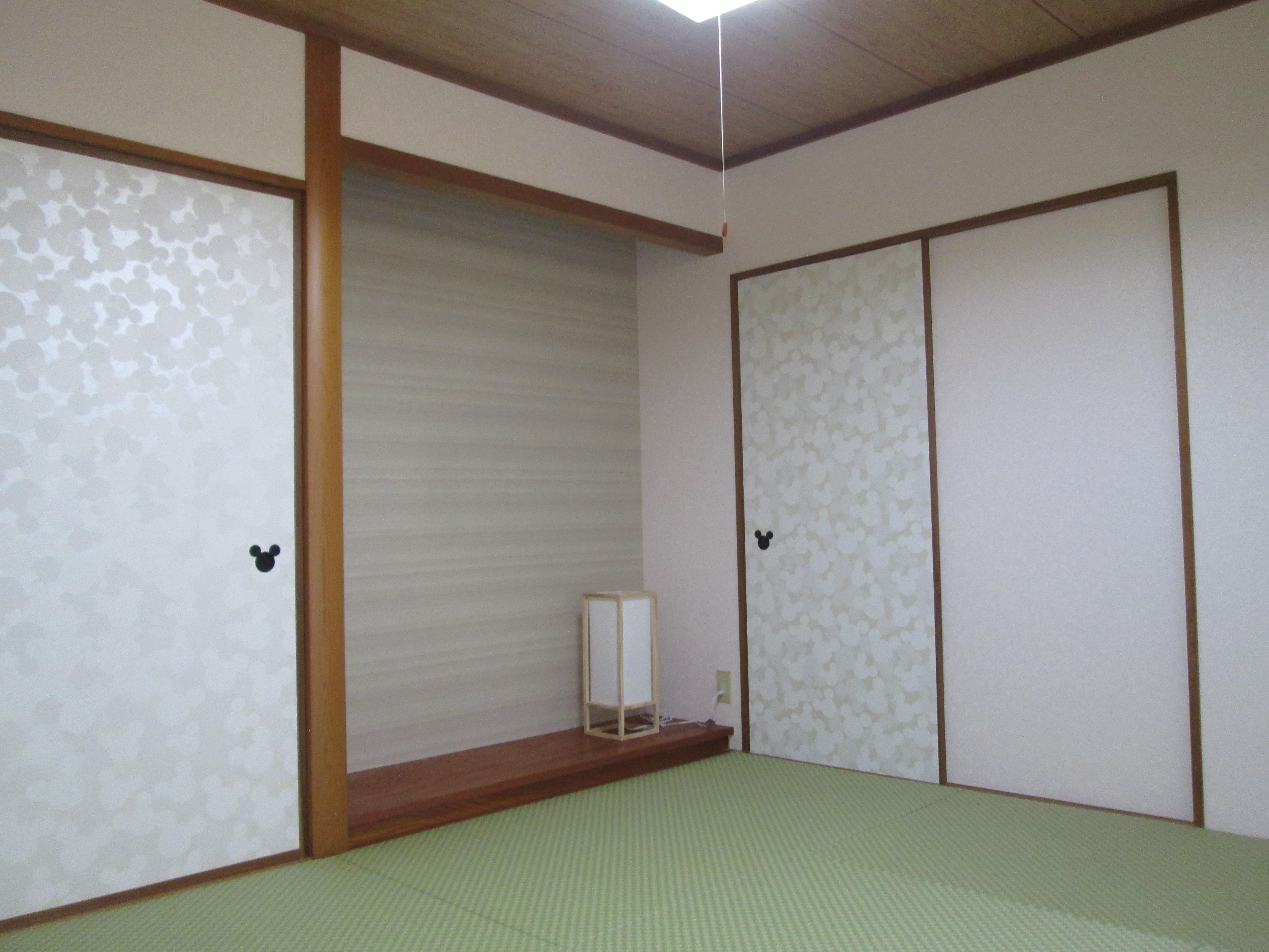すっかり傷んでしまった和室をリフレッシュしました。 壁のクロスを貼替、 畳は和紙の市松、縁無し。 さわやかな素敵な和室になりました。
