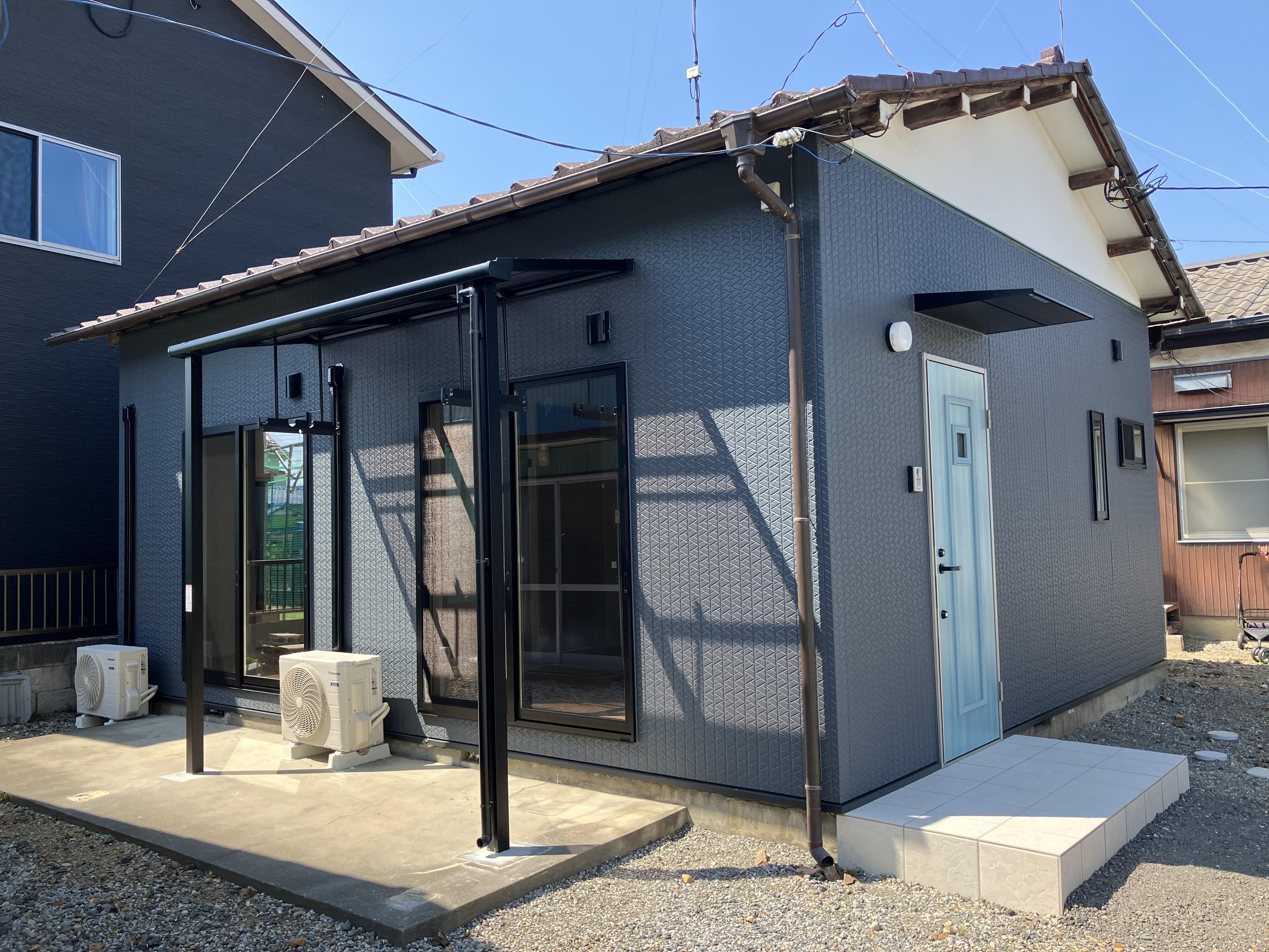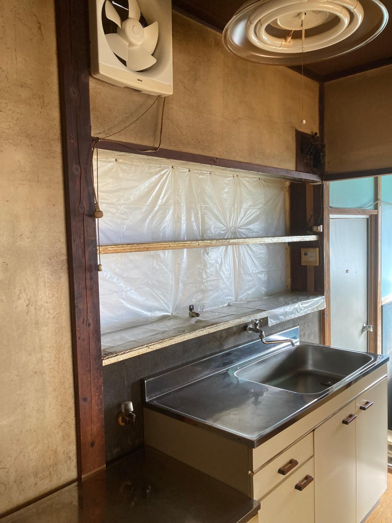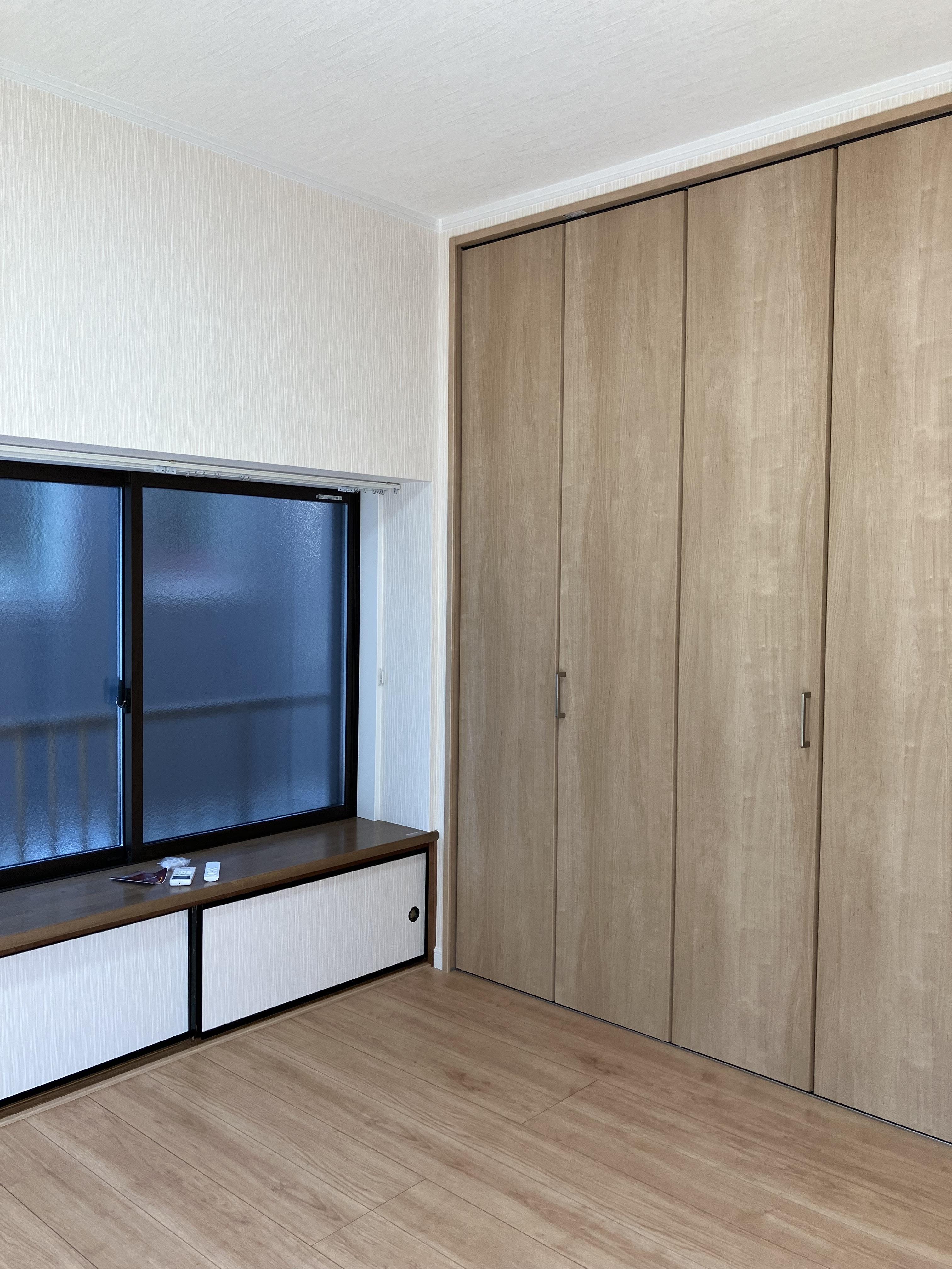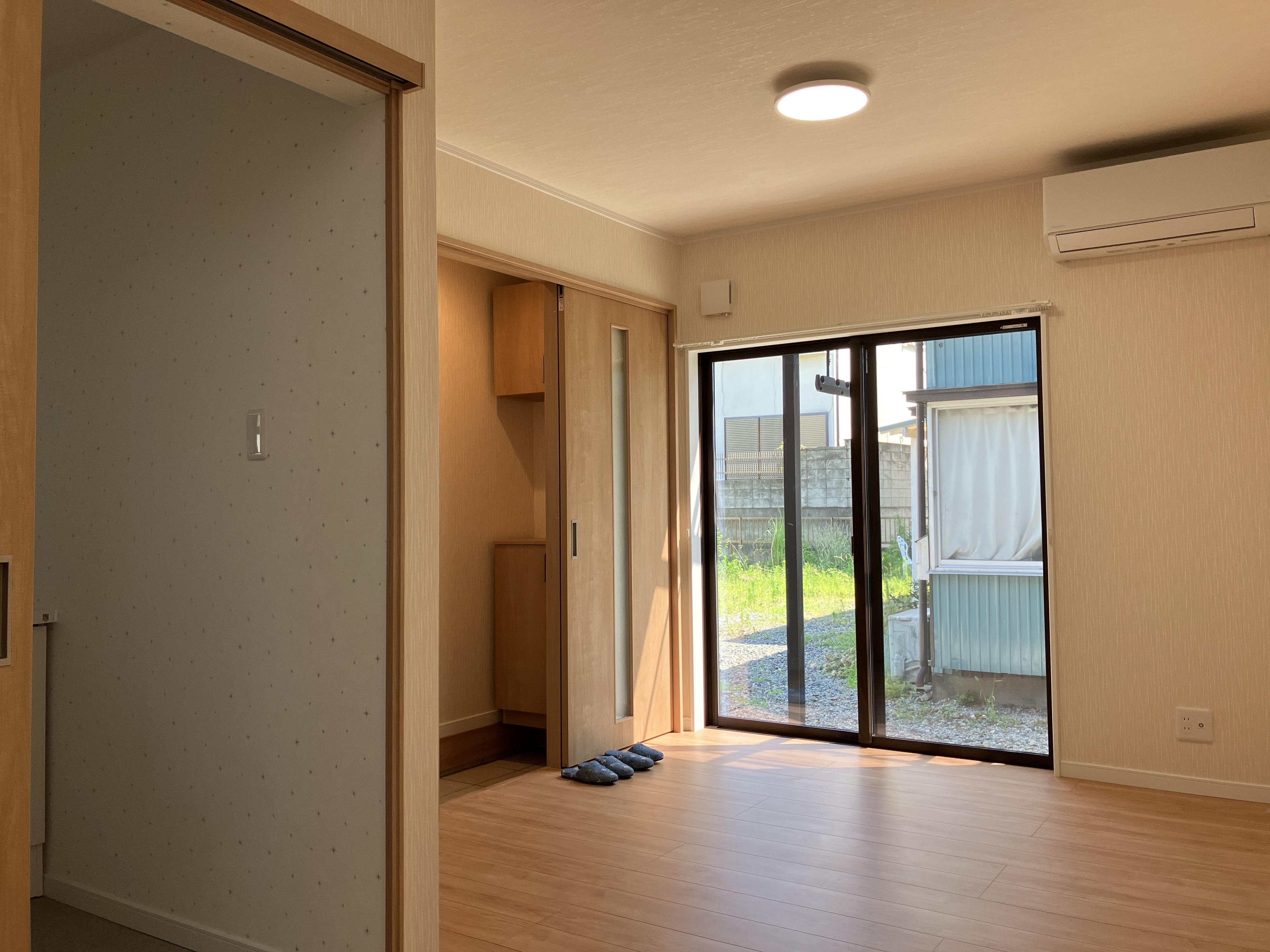 古い戸建て貸家のリニューアル工事。 和室2部屋(4.5畳、6畳)にキッチンと浴室とトイレで、洗面脱衣室が無い間取りだったのですが、1LDK 断熱性能を上げて、コンパクトですが収納も確保してスッキリした間取りになりました。