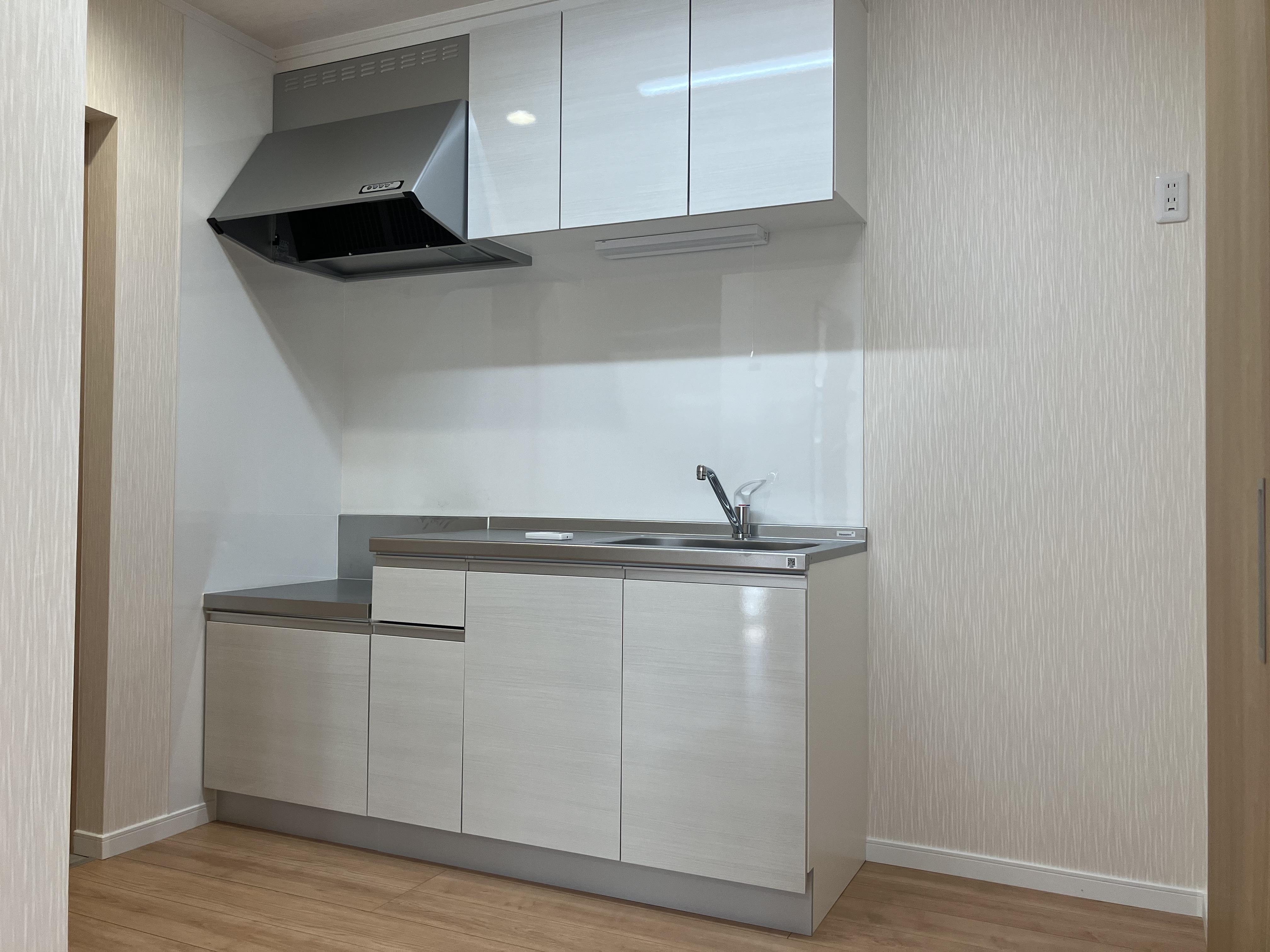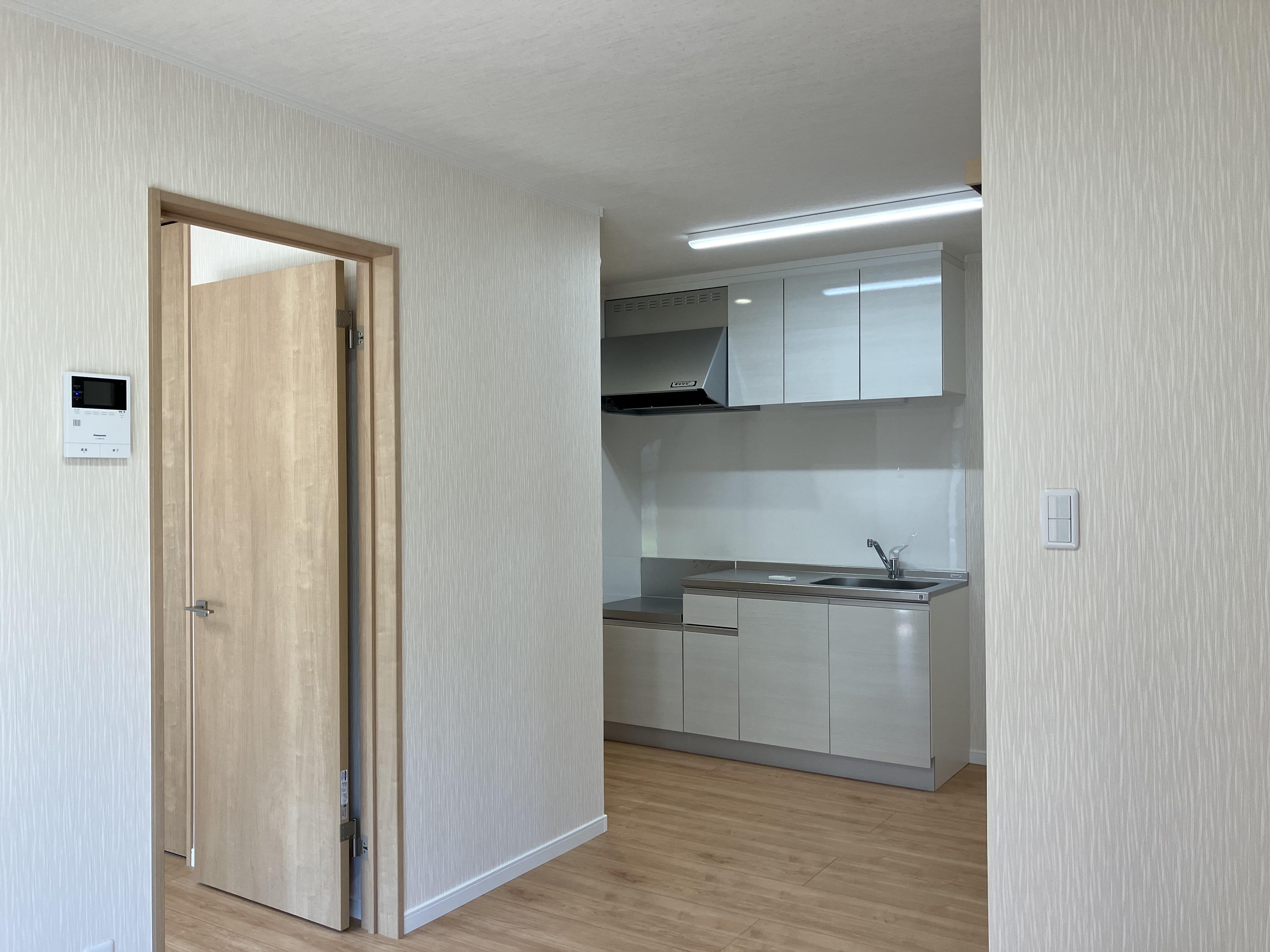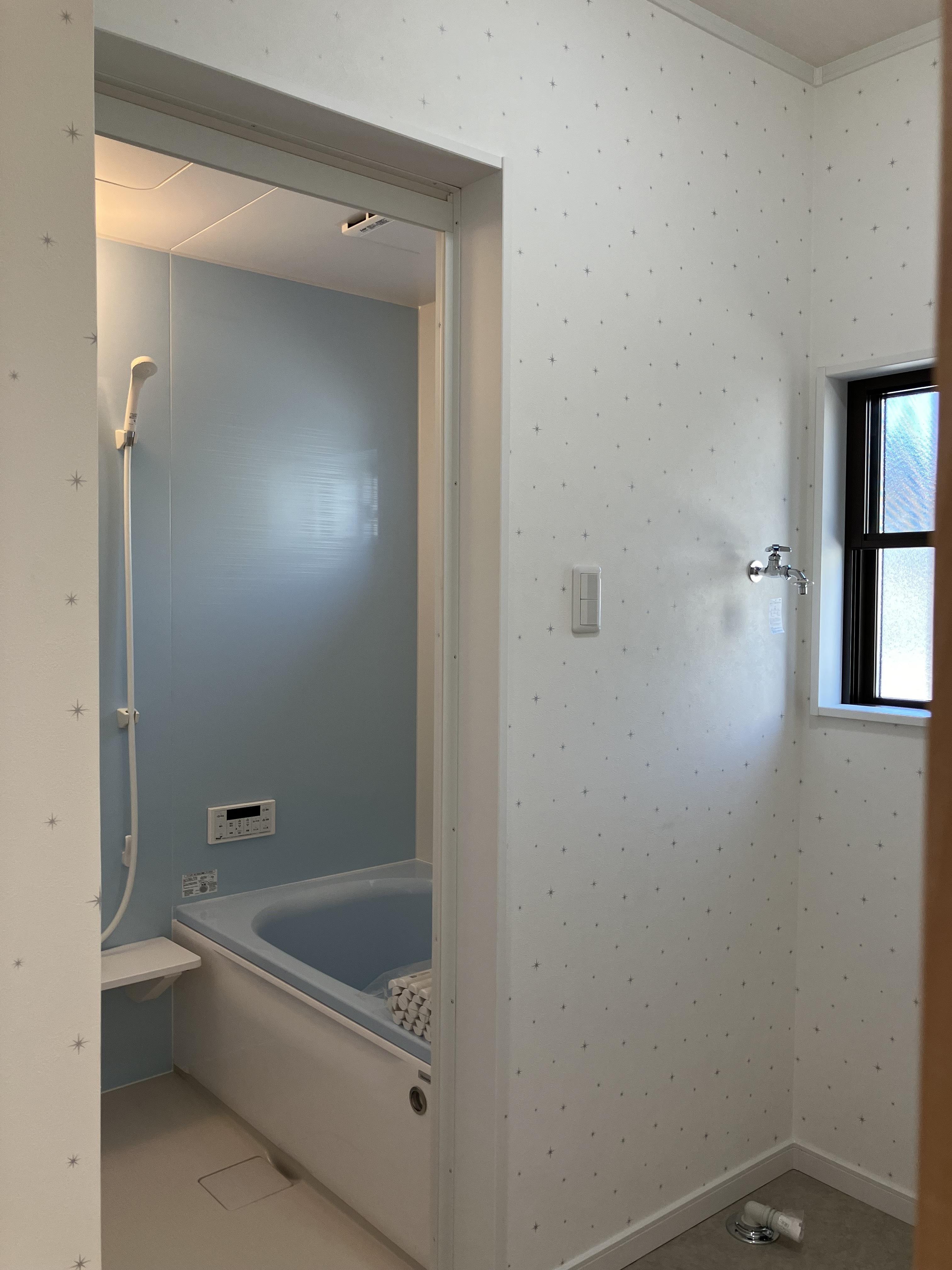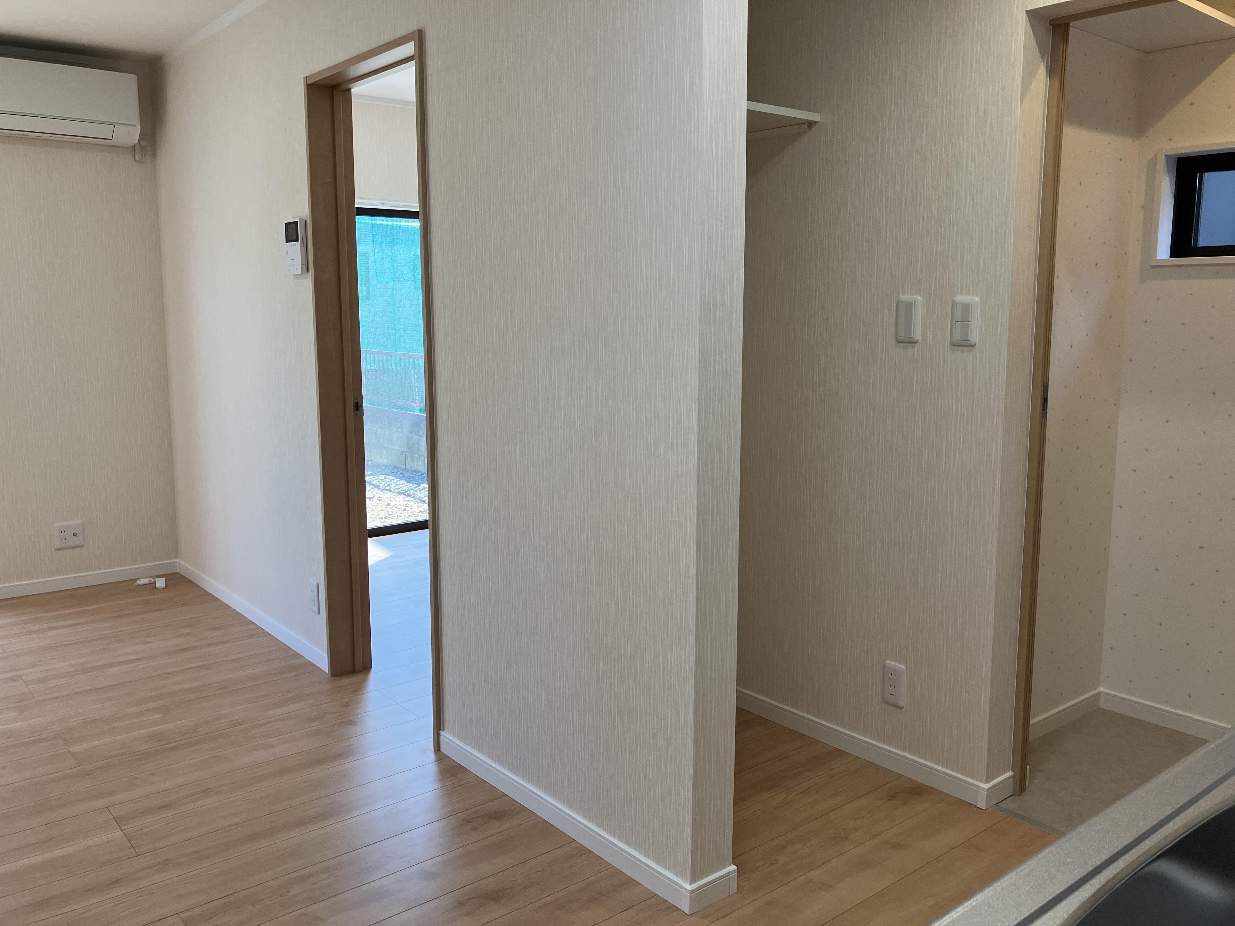 古い戸建て貸家のリニューアル工事。 和室2部屋(4.5畳、6畳)にキッチンと浴室とトイレで、洗面脱衣室が無い間取りだったのですが、1LDK 断熱性能を上げて、コンパクトですが収納も確保してスッキリした間取りになりました。