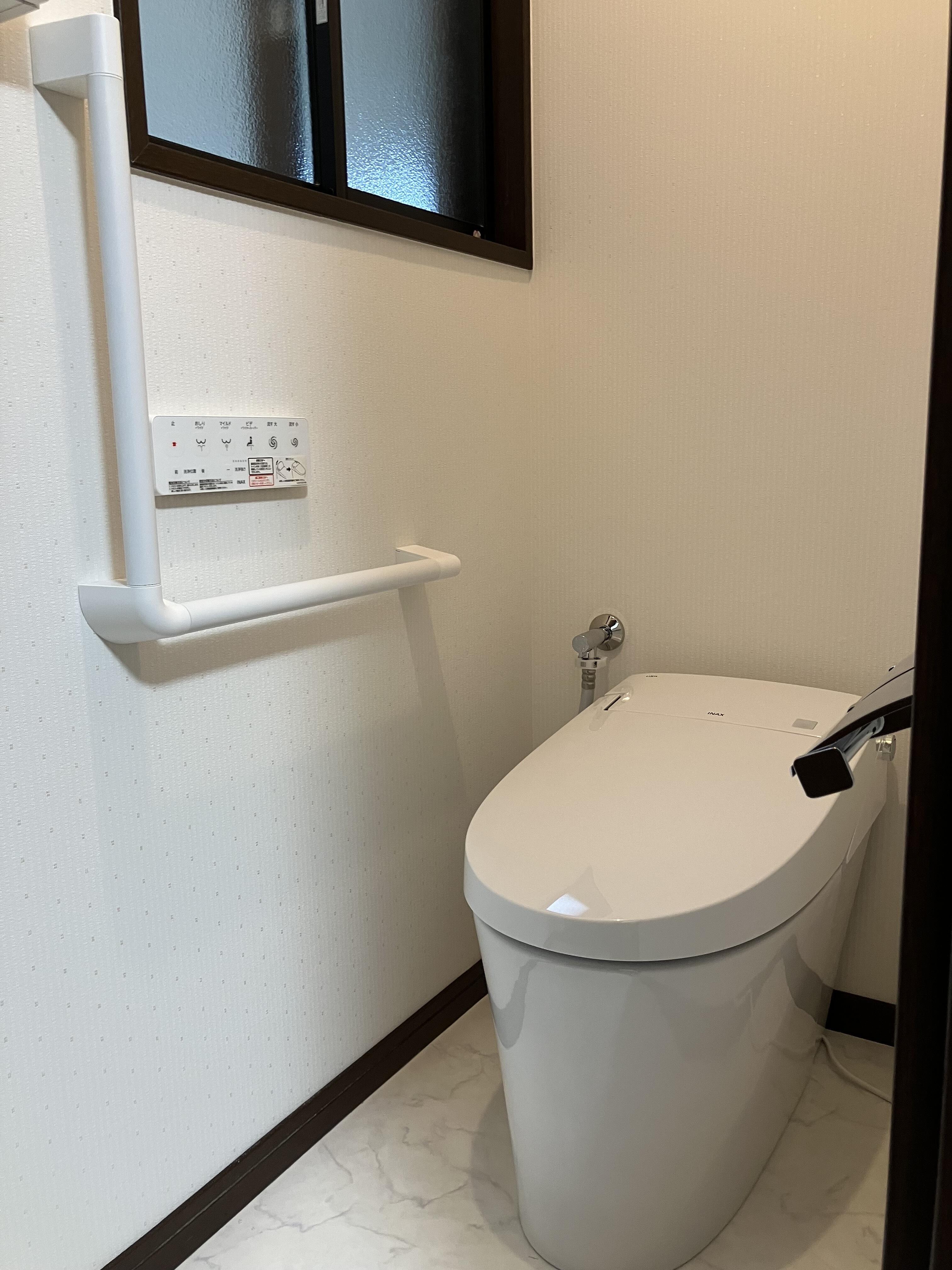 トイレリフォーム タンクレストイレ採用。将来を考え手すりを付けました。 内窓も取付、補助金を活用しました。