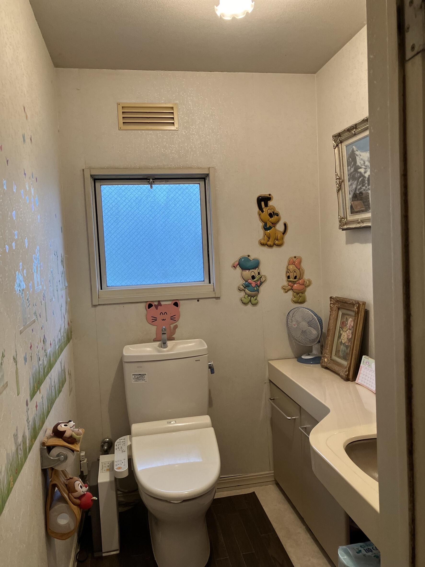 トイレに換気扇を付けたい。とのご依頼でした。 ガラリはあったのですが、ニオイがなんとなく気になるとの事で 一緒に壁と床もイメージチェンジしました。 ガラリはふさいで人感タイプの換気扇を設置しました。 素敵なトイレルームになりました。