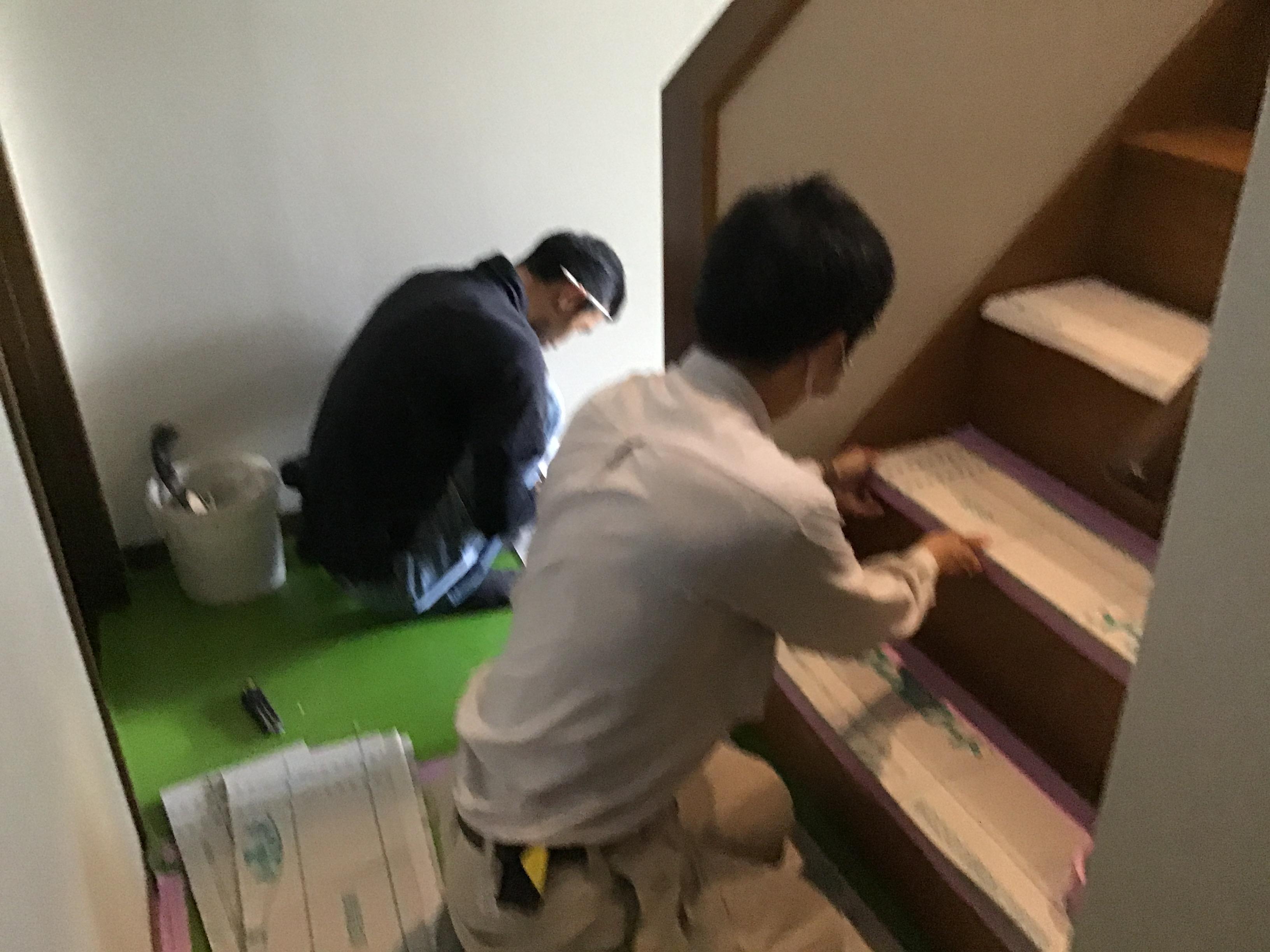 初日に現場担当の高橋と設備屋さんと床養生をしました。