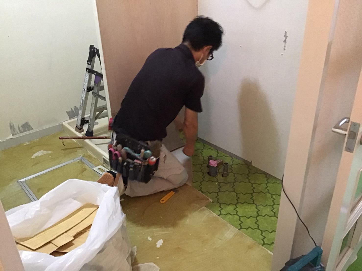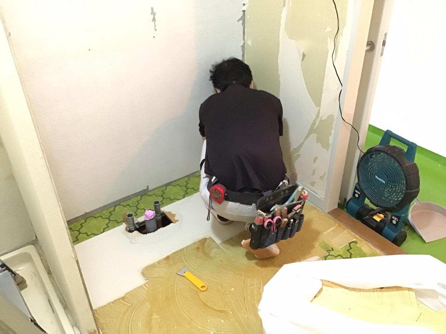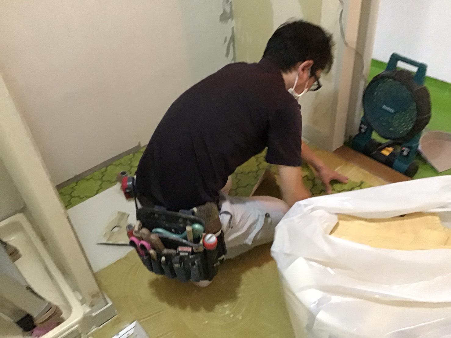 洗面化粧台を外して内装工事中です。床のクッションフロアが硬くなっていたりしてなかなか剥がれない事もあります。