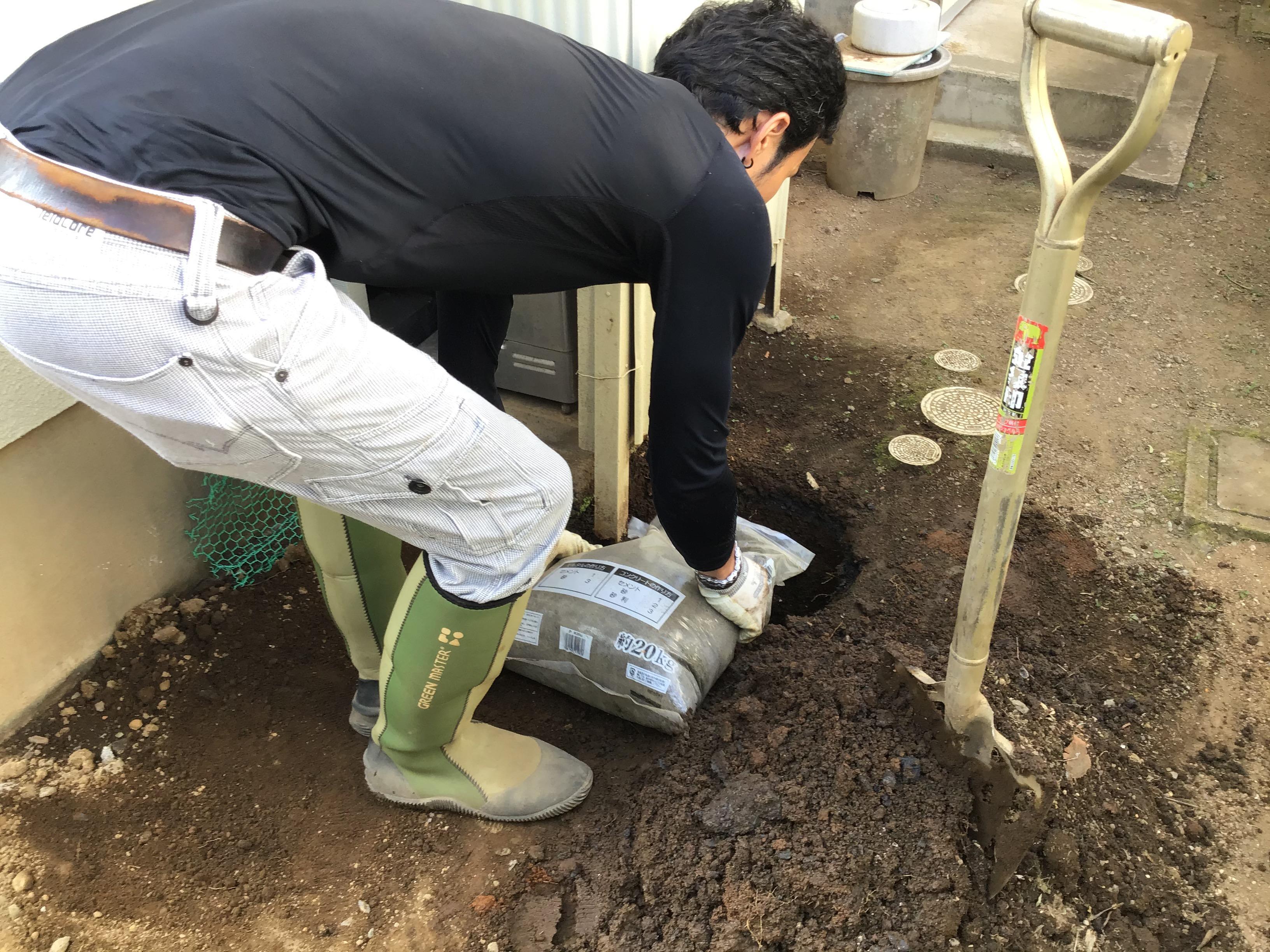 接着剤が乾いたのでお客様がご用意してくれたセメントをいれて土を戻して完成!!