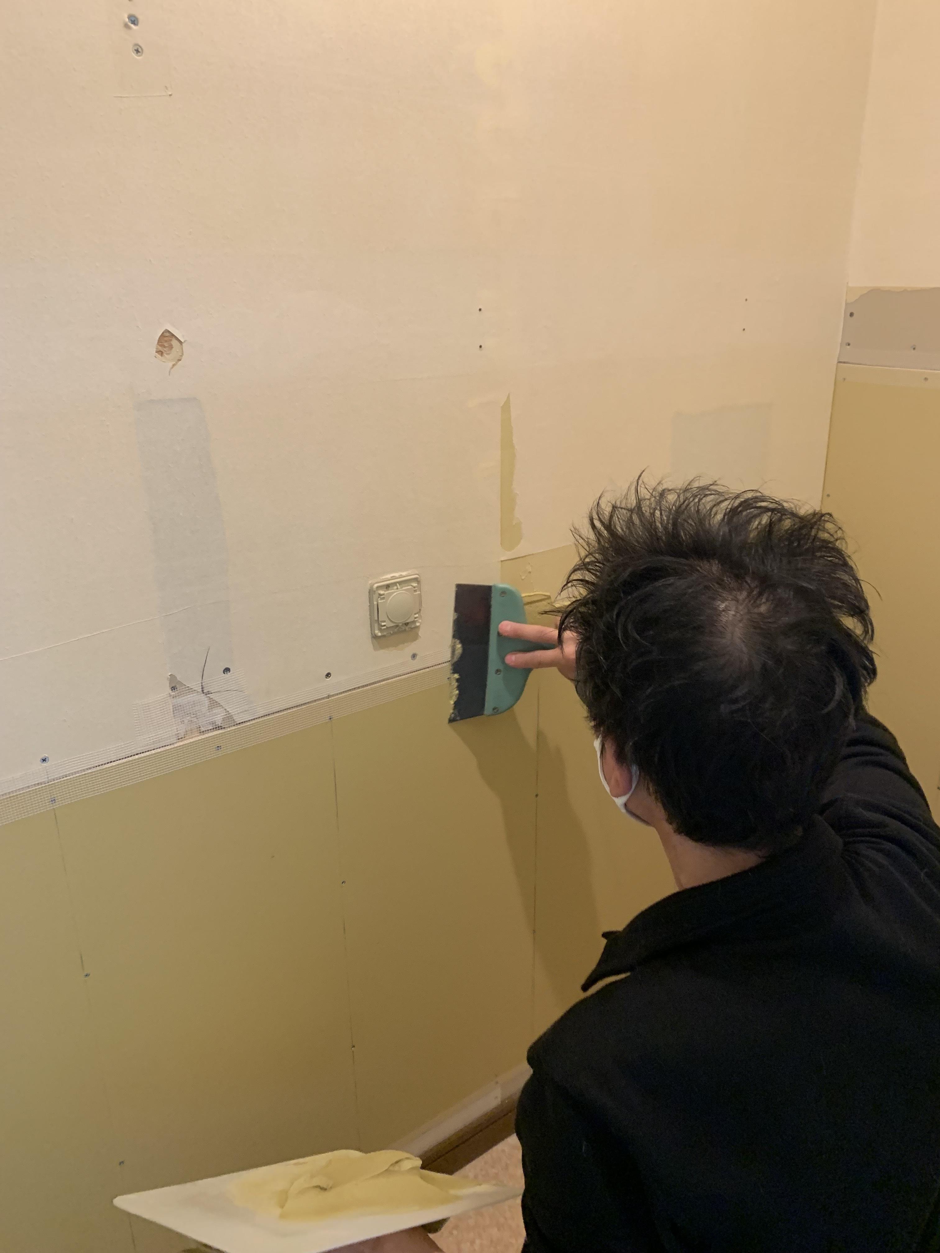 11:00〜 クロス屋さんがクロス、クッションフロアを剥がして パテ処理をします。