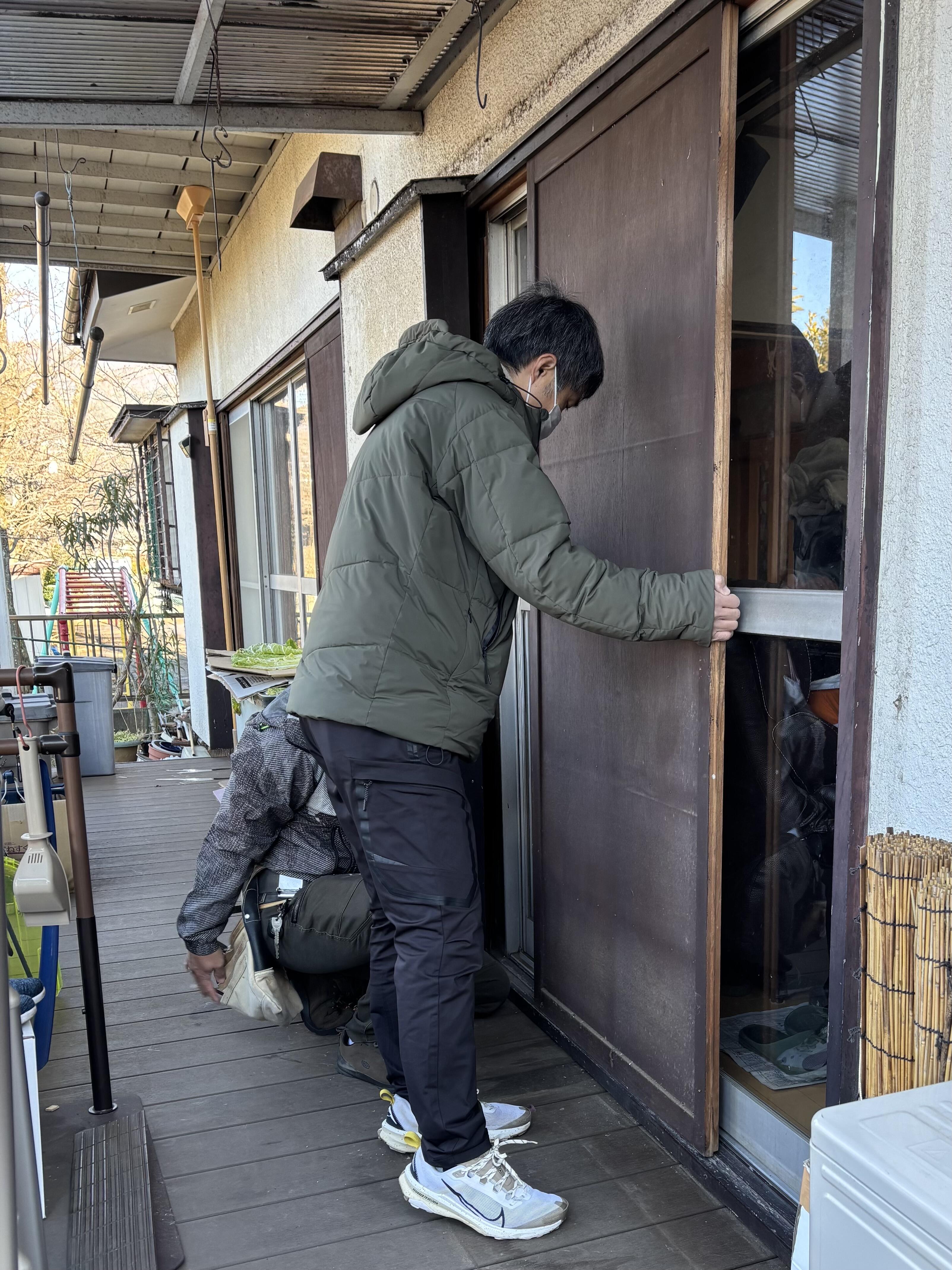 雨戸撤去する前にウッドデッキの上に落ち葉が溜まっていましたが佳文さんが清掃していました