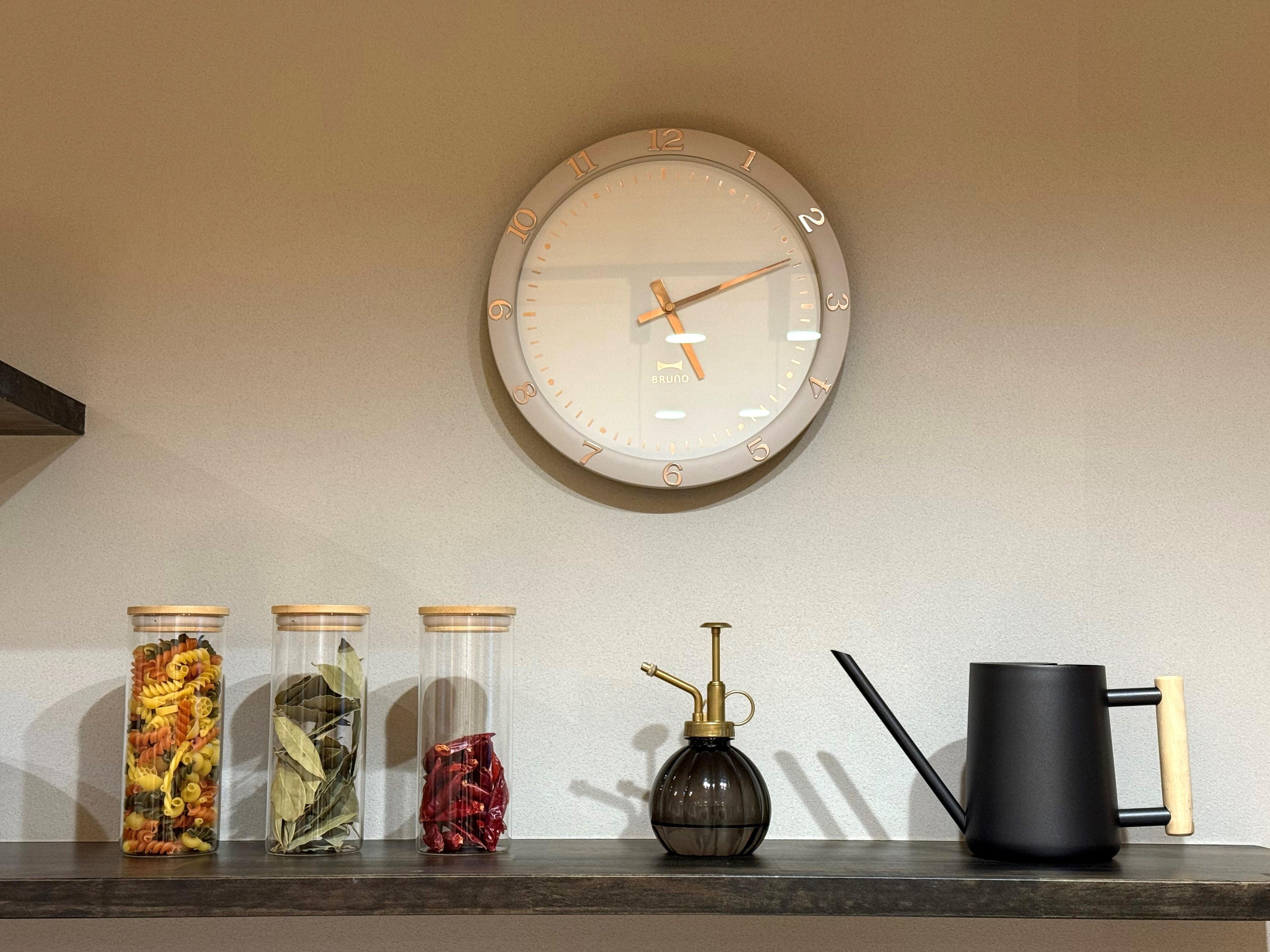 とはいえ、限られた予算の中でどうするか悩みながら、100円ショップを巡ってあれこれ探しました。ダイソーで、かわいいクッキージャーやガラスキャニスターを発見!最初は空のまま飾っていましたが、「やっぱり中に何か入れたほうが暮らしのイメージが湧くよね!」という話になり、中身を探し始めました。