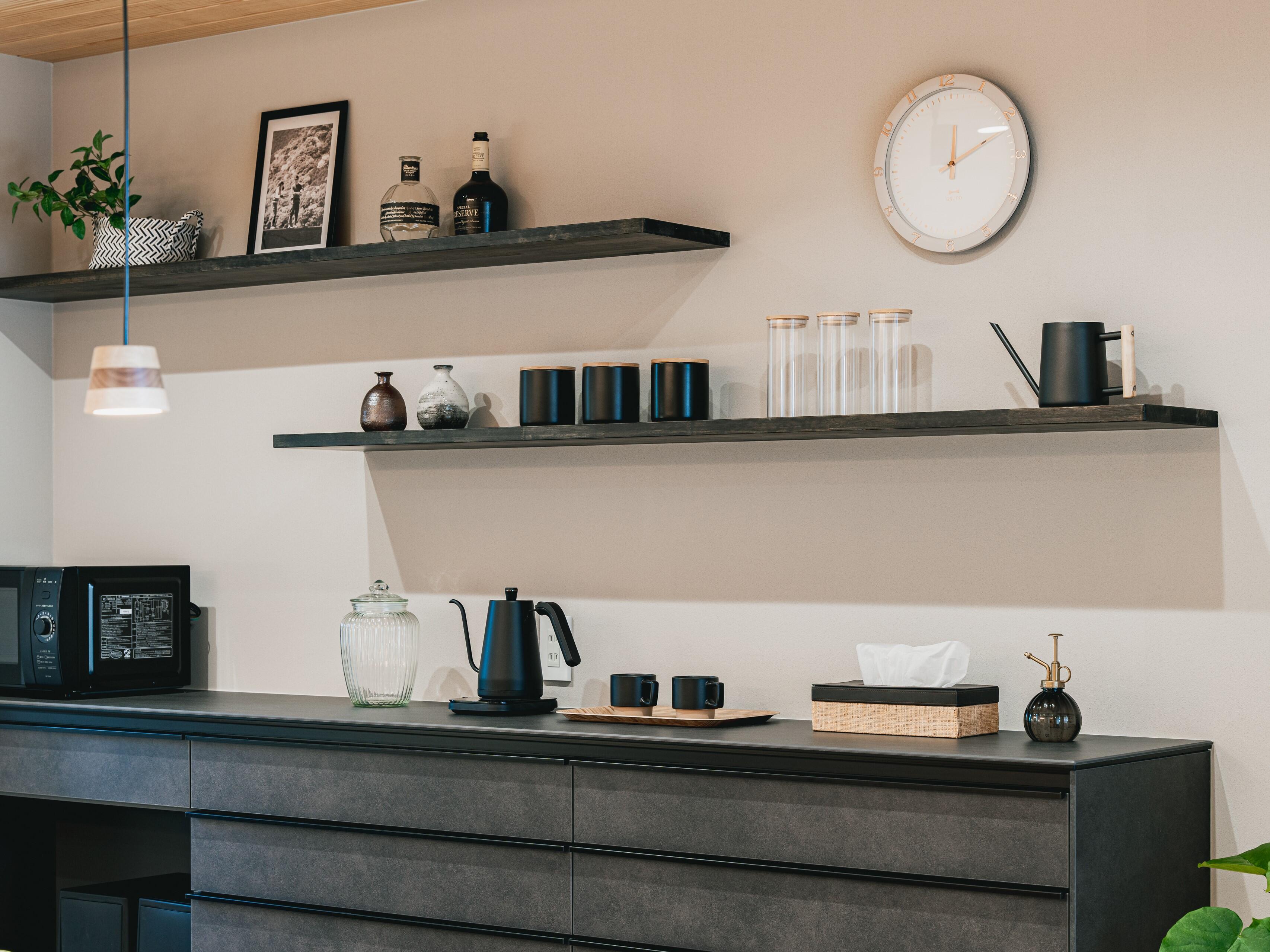 これで、ブラックのキッチンに彩りが加わり、より暮らしのイメージが湧く空間になりました♪