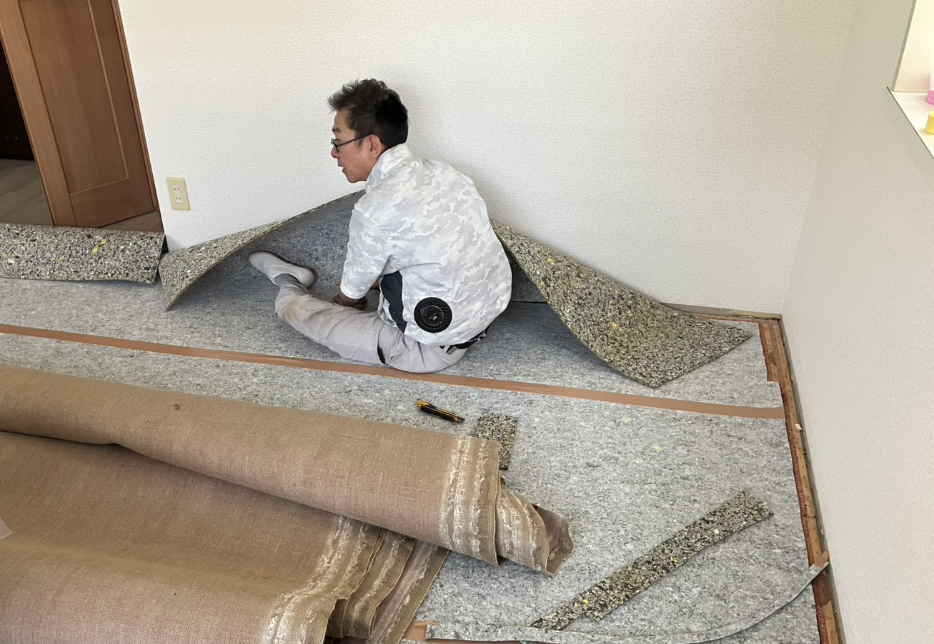 内装屋さんがカーペットとフェルトを剥がして新しいフェルトを貼っていました。