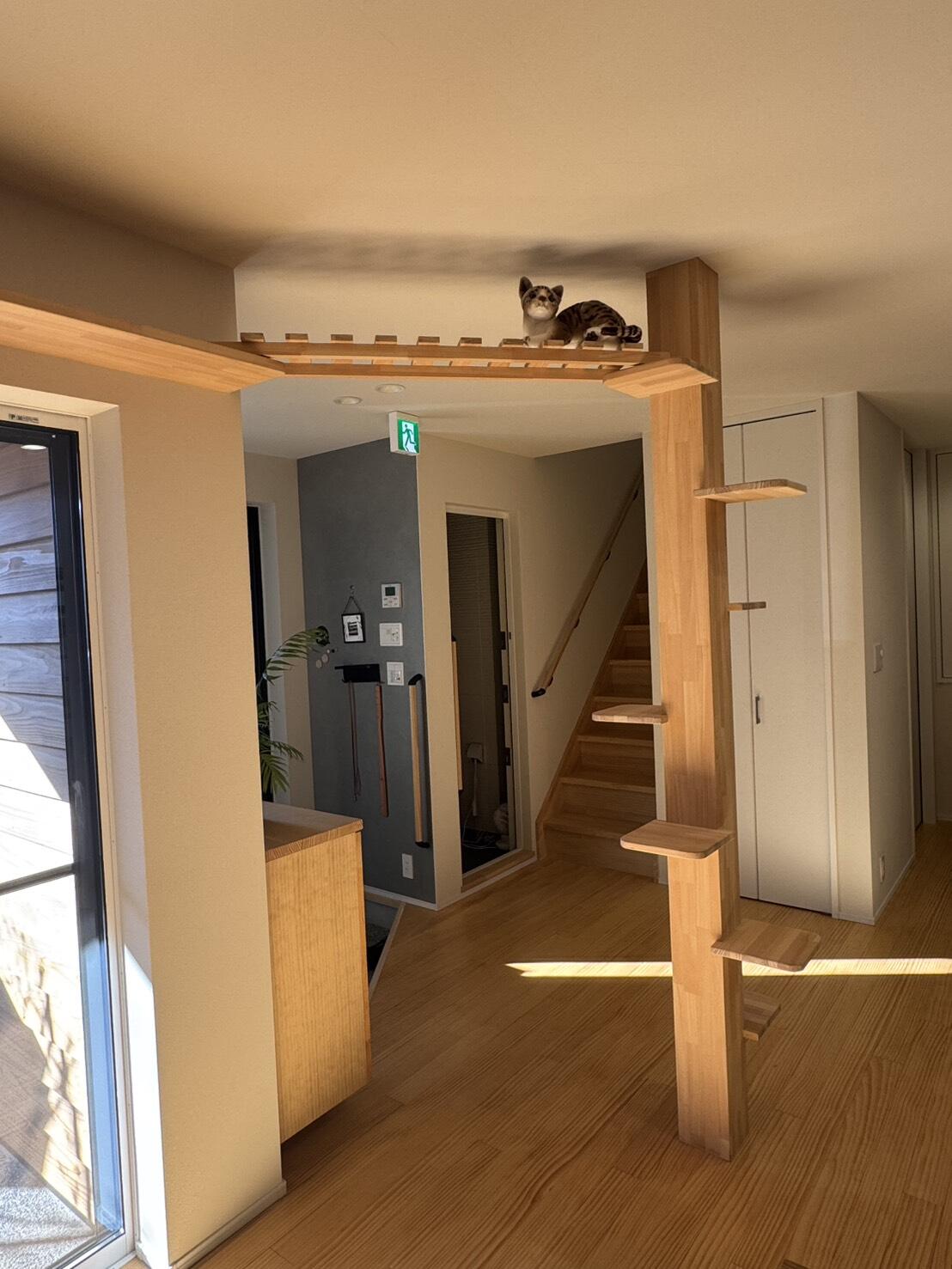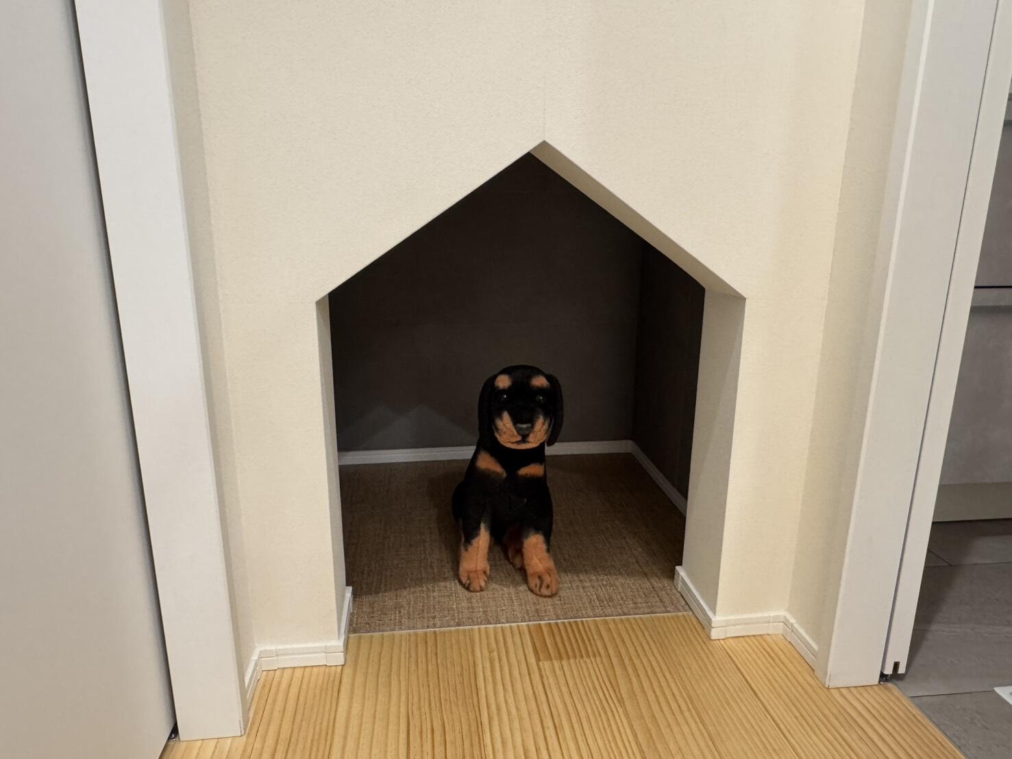 このモデルハウスは、ペットと暮らせるお家がコンセプトになっており、柱にはキャットタワーが設置されています。お部屋の一部として自然に馴染むデザインで、猫ちゃんものびのびと過ごせそうだと感じました。さらに、ワンちゃん用の隠れ家も用意されており、その中にはエコカラットが使用されているため、気になるにおい対策もばっちりです。人もペットも快適に暮らせる工夫が随所に感じられ、愛猫家の方はもちろん、ワンちゃんと暮らしている方にもぜひ一度見ていただきたいポイントです。